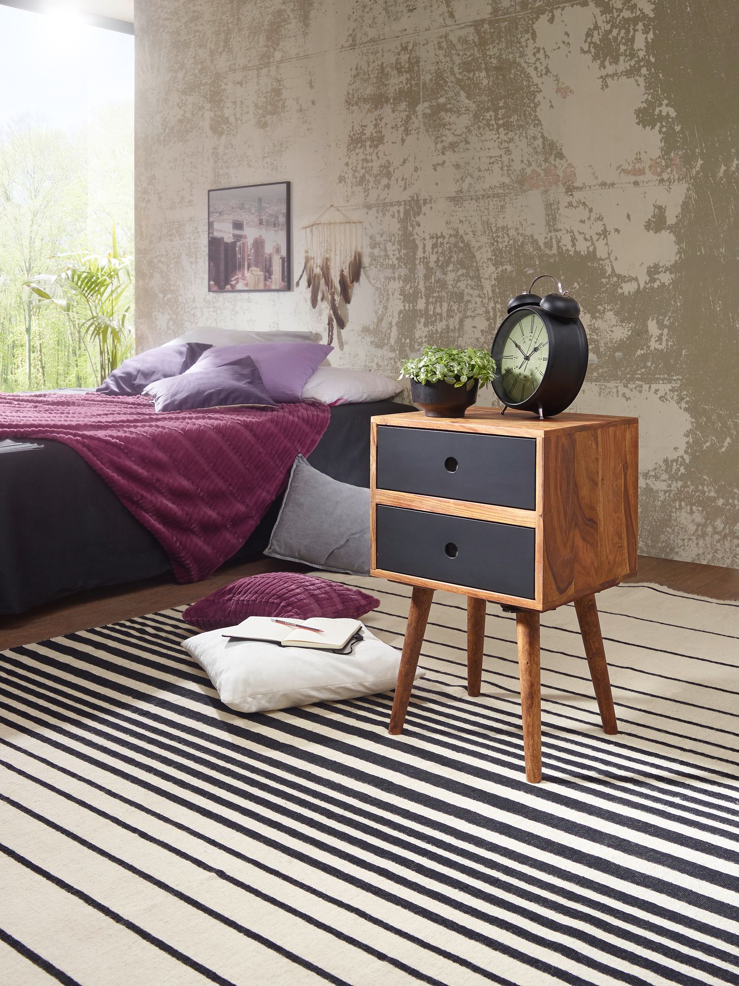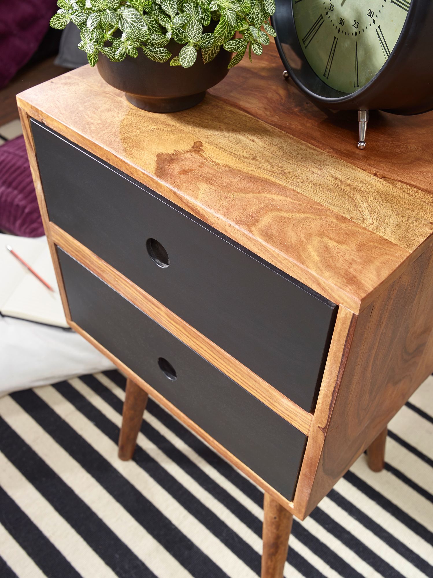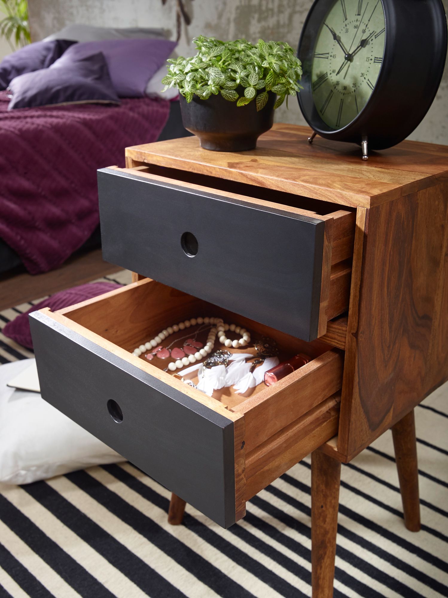 Info sui prodotti "Retro comodino repa / sheesham comodino in legno con 2 cassetti marrone scuro / nero"