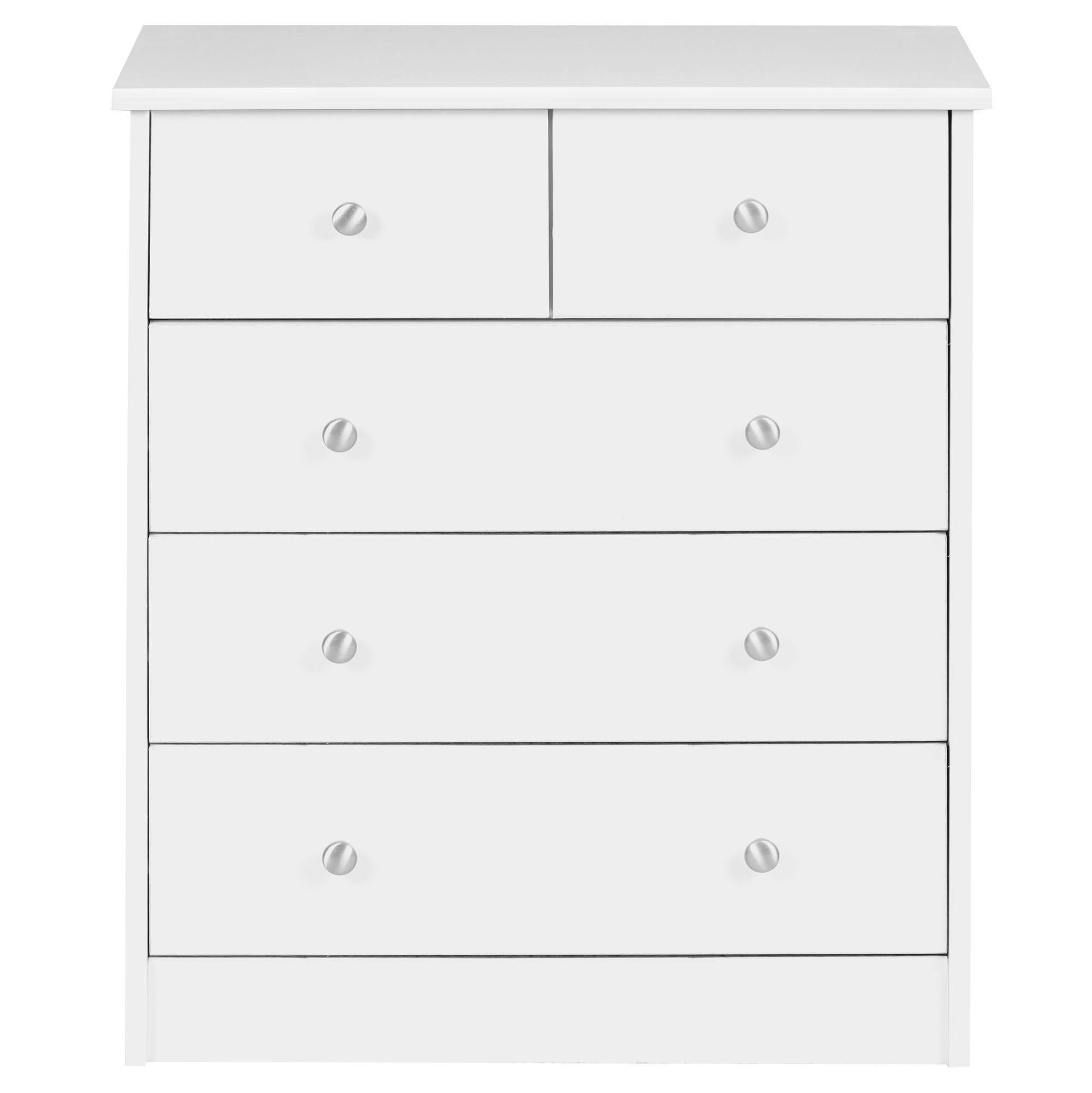 Questa cassettiera bianca in legno presenta un design moderno con cinque cassetti di diverse dimensioni, ciascuno con manopole in alluminio argentato. Ideale per utilizzo versatile in ingressi o sale da pranzo.