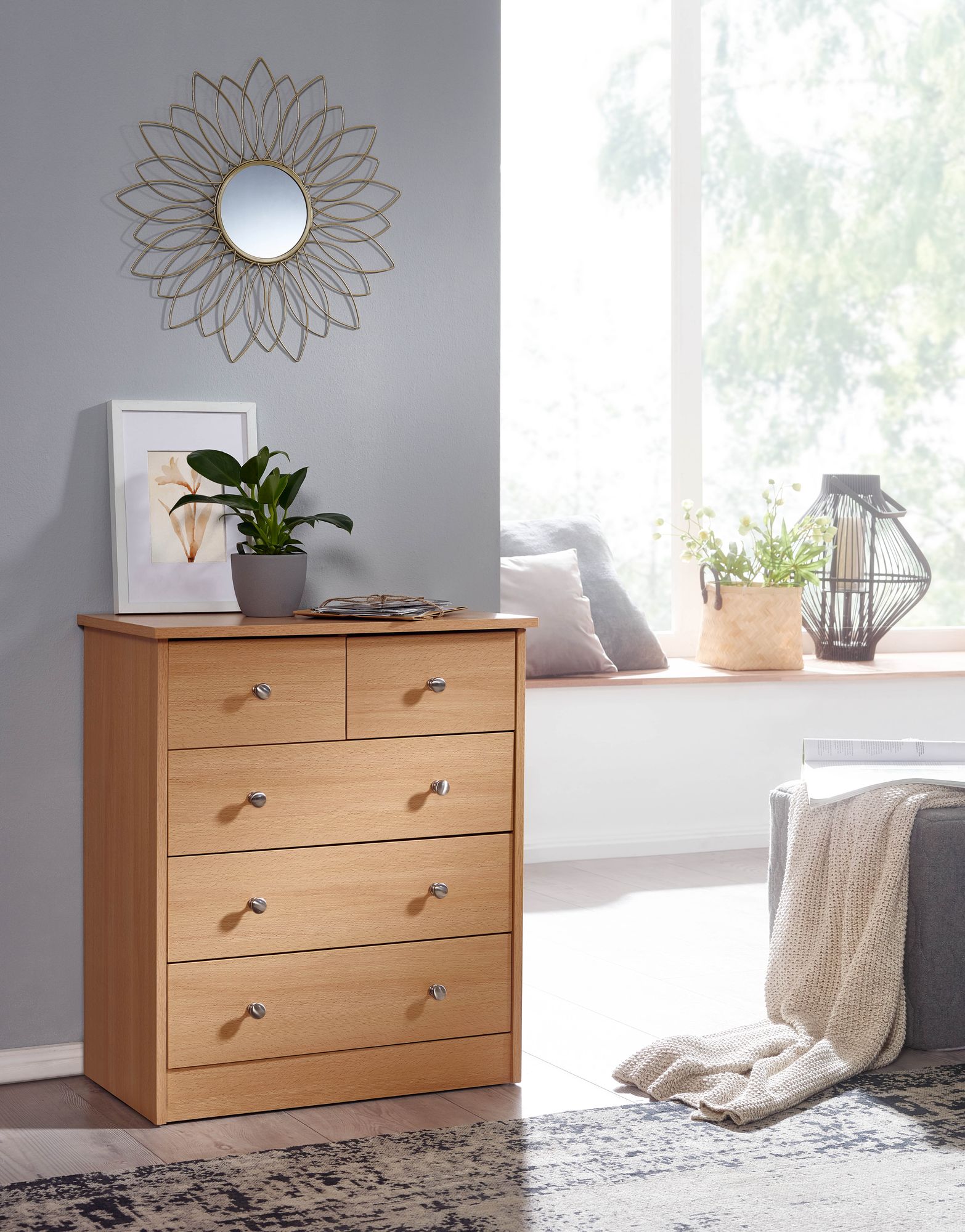 Questa cassettiera in legno di faggio chiaro presenta un design moderno con cinque cassetti di due dimensioni, ciascuno con manopole in alluminio effetto argento.