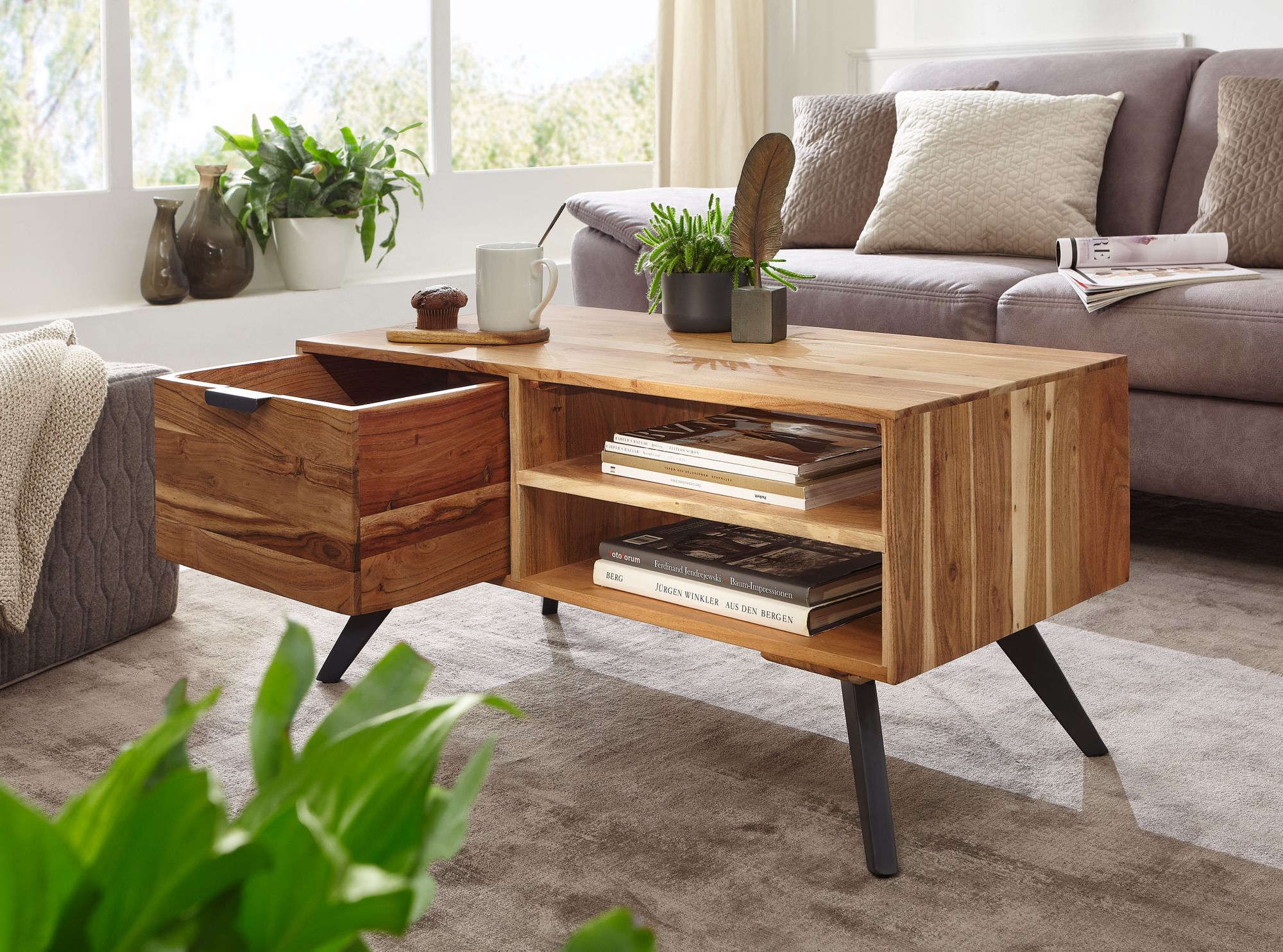 Aggiungi carattere al tuo soggiorno con questo tavolino in legno massello di acacia. Il design robusto unisce il colore marrone del legno alle gambe metalliche grigie, con un cassetto funzionale accessibile da entrambi i lati per ottimizzare lo spazio.
