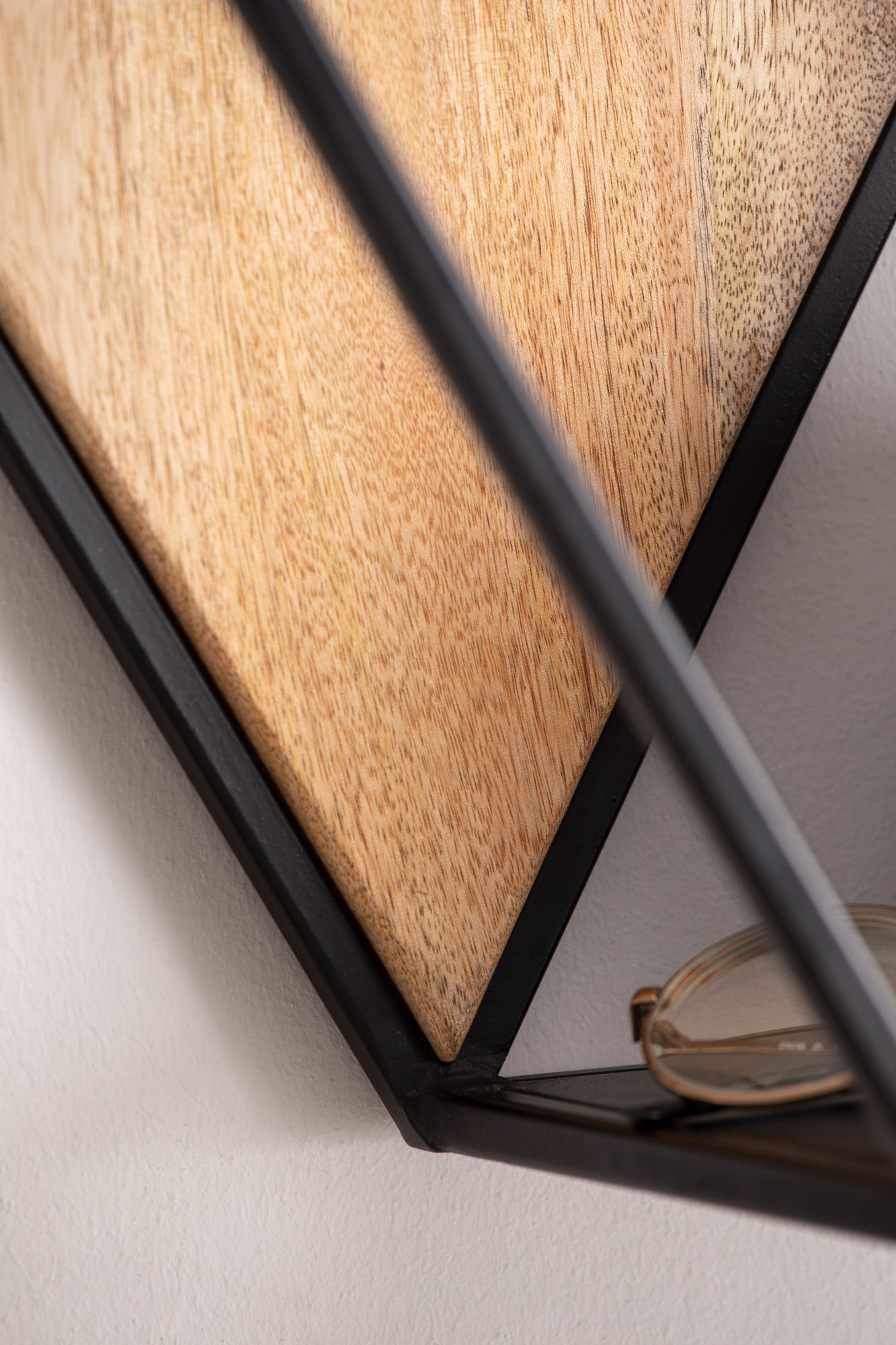Questa mensola da parete esagonale coniuga robustezza ed estetica con legno massello di mango e struttura in metallo nero verniciato a polvere. Presenta tre ripiani neri fissi con schienale marrone chiaro, ideale per esporre decorazioni o piante.
