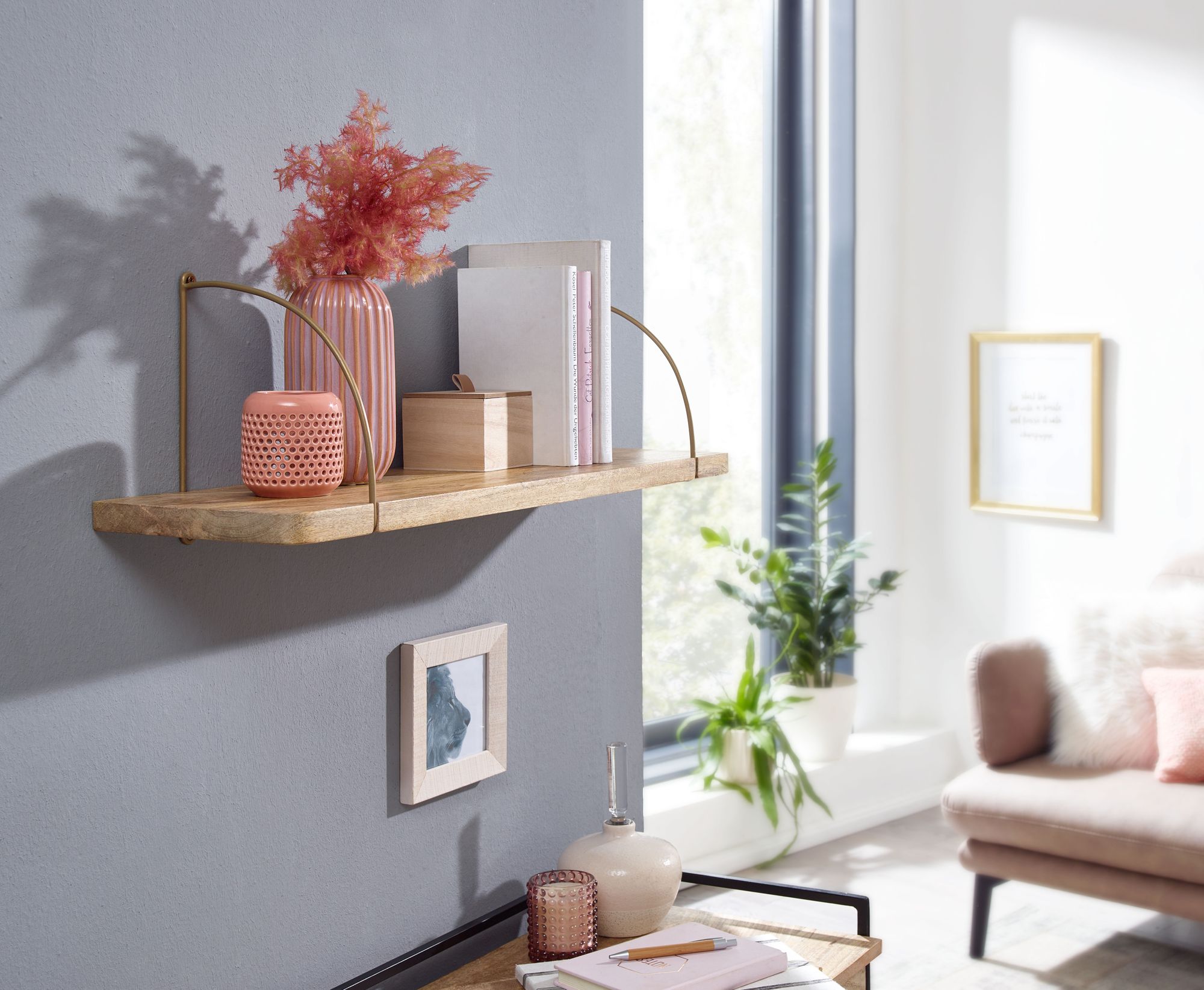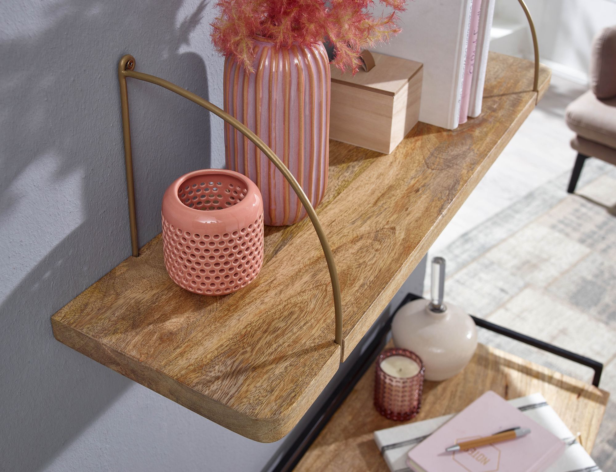 Scoprite questa mensola da parete dallo stile industriale, realizzata in legno massello di mango con supporti in metallo dorato. Artigianale e unica, ideale per esporre foto, libri o oggetti decorativi, dona un tocco caldo e moderno agli ambienti.