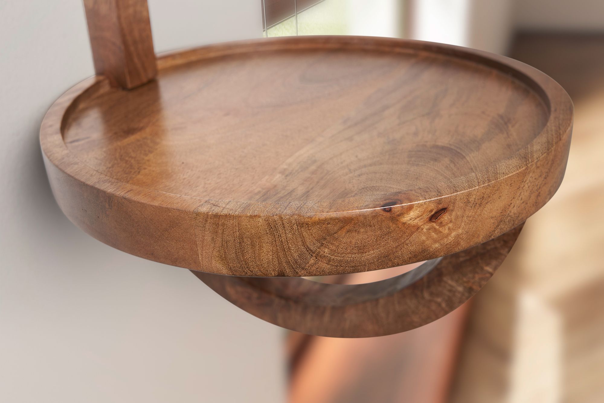 Aggiungi un tocco naturale e moderno al tuo ambiente con questa mensola da parete rotonda in legno massello di mango finitura marrone scuro. Ideale per piante, oggetti decorativi o come comodino sospeso.