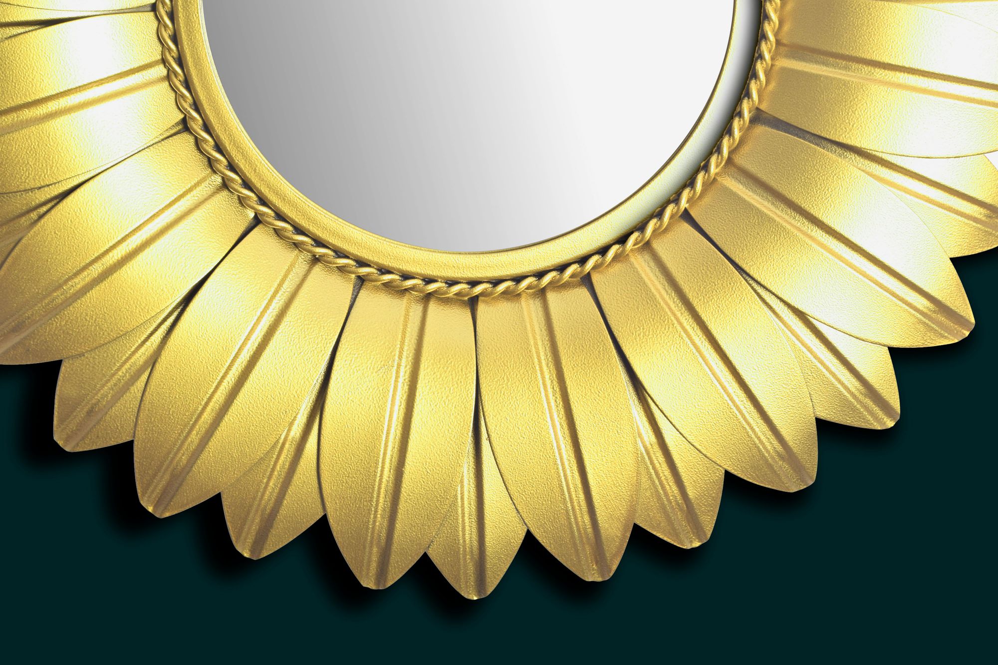 Aggiungi eleganza e luminosità ai tuoi ambienti con questo specchio da parete a forma di girasole. Il telaio in metallo dorato e la forma rotonda di 60 cm lo rendono un elemento decorativo unico per ingresso, soggiorno o camera da letto.
