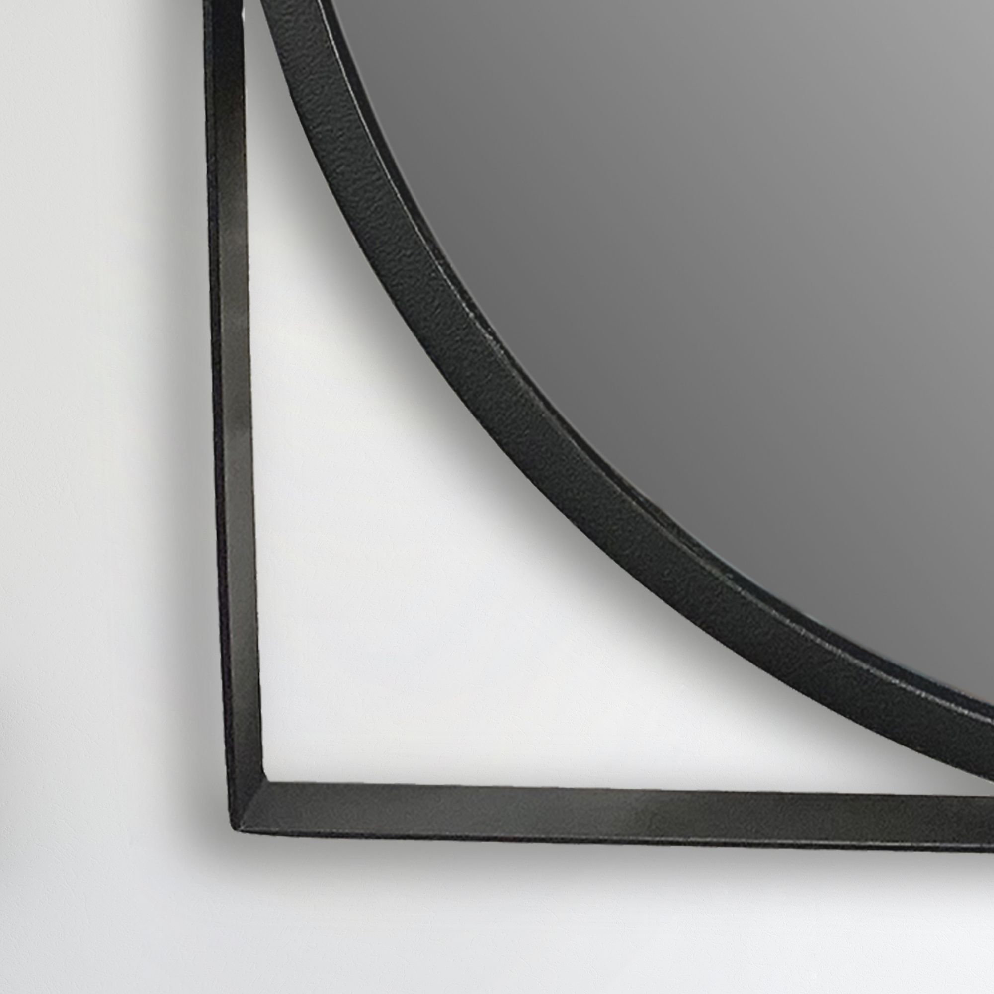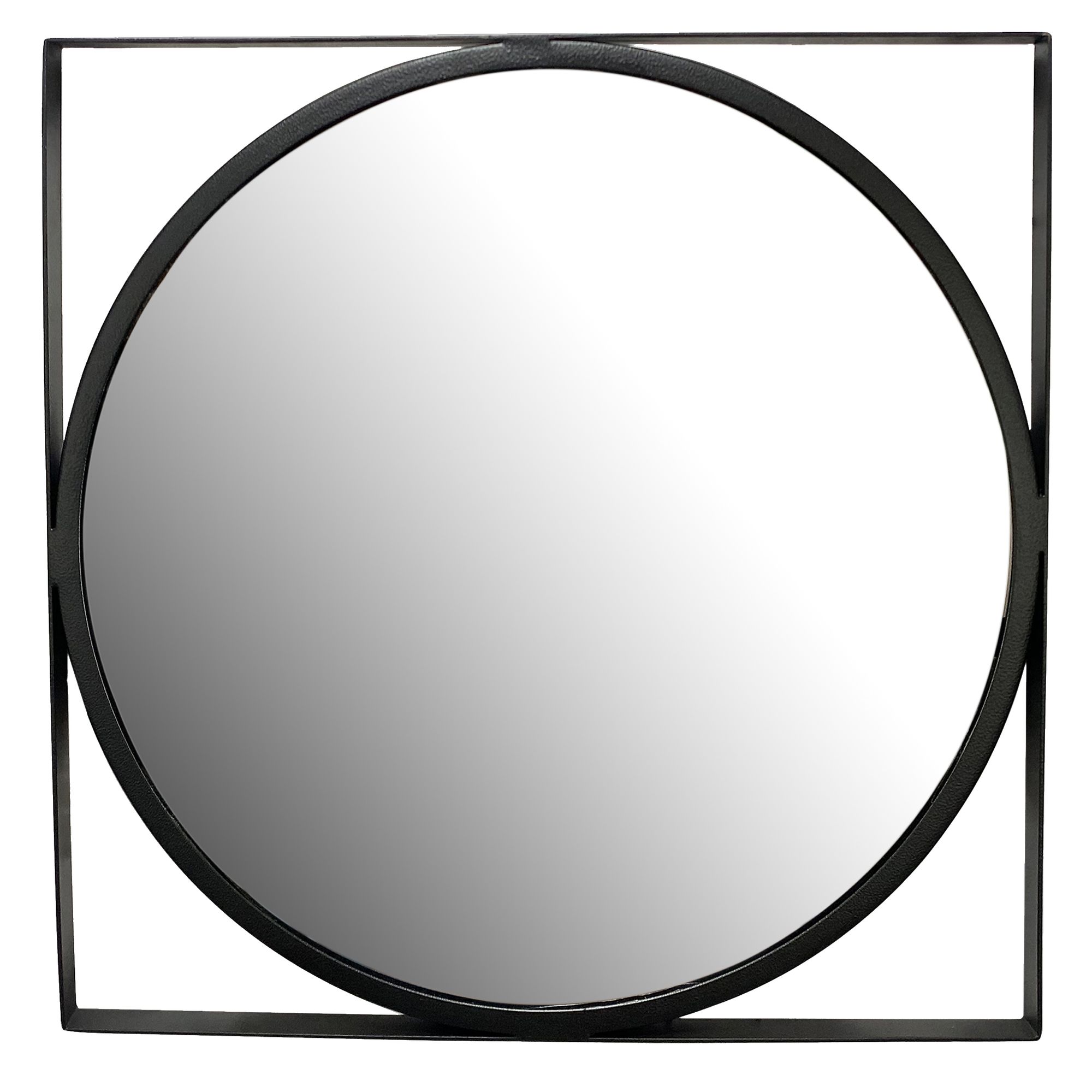Specchio da parete moderno in metallo nero con superficie rotonda di 50x50 cm incorniciata da una struttura quadrata. Adatto a corridoi, soggiorni e camere da letto.