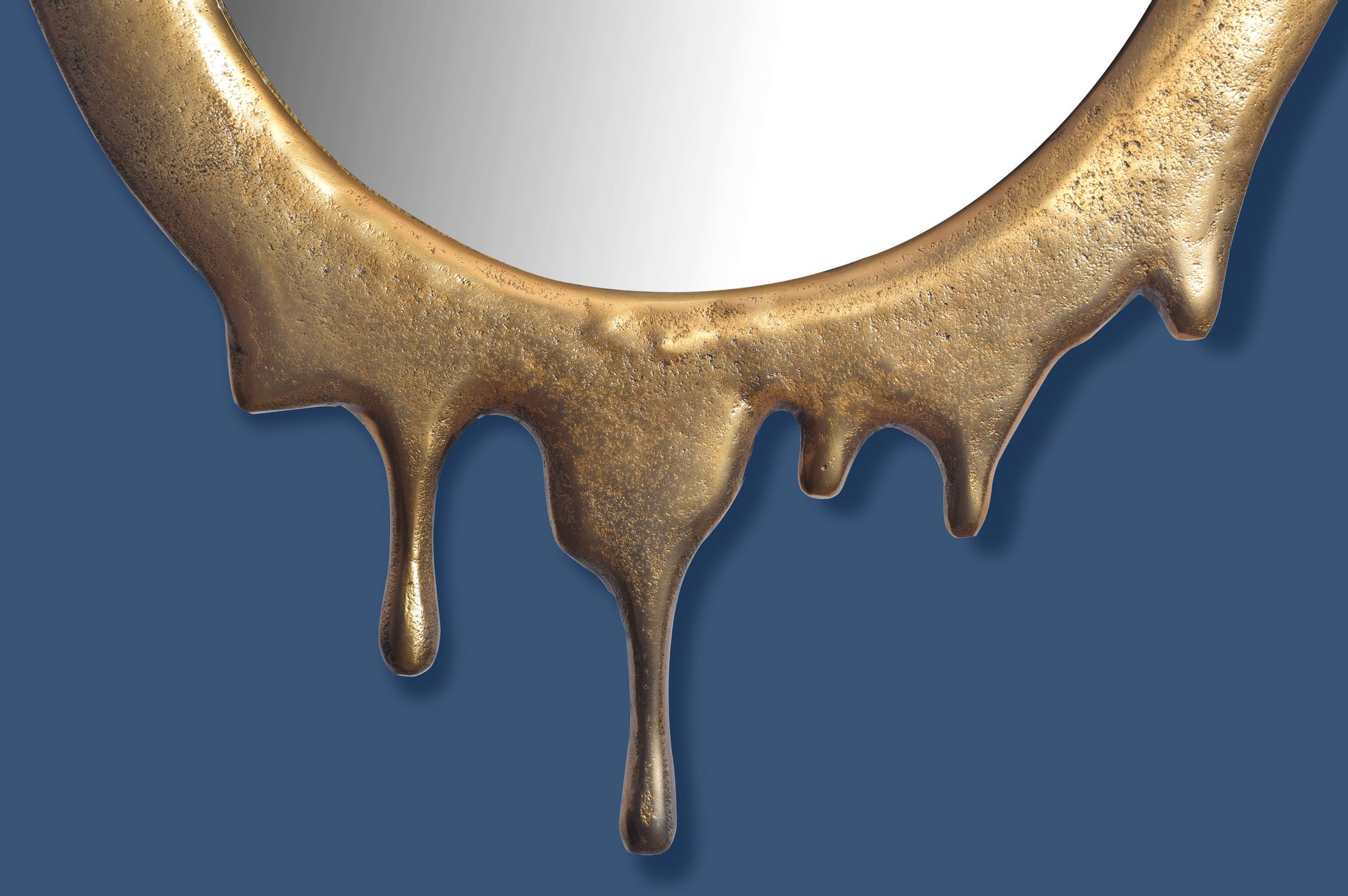 Aggiungi originalità al tuo interno con questo specchio da parete ovale dotato di cornice in alluminio dorato con effetto metallo fuso nella parte inferiore. Ogni pezzo è realizzato a mano ed è unico.