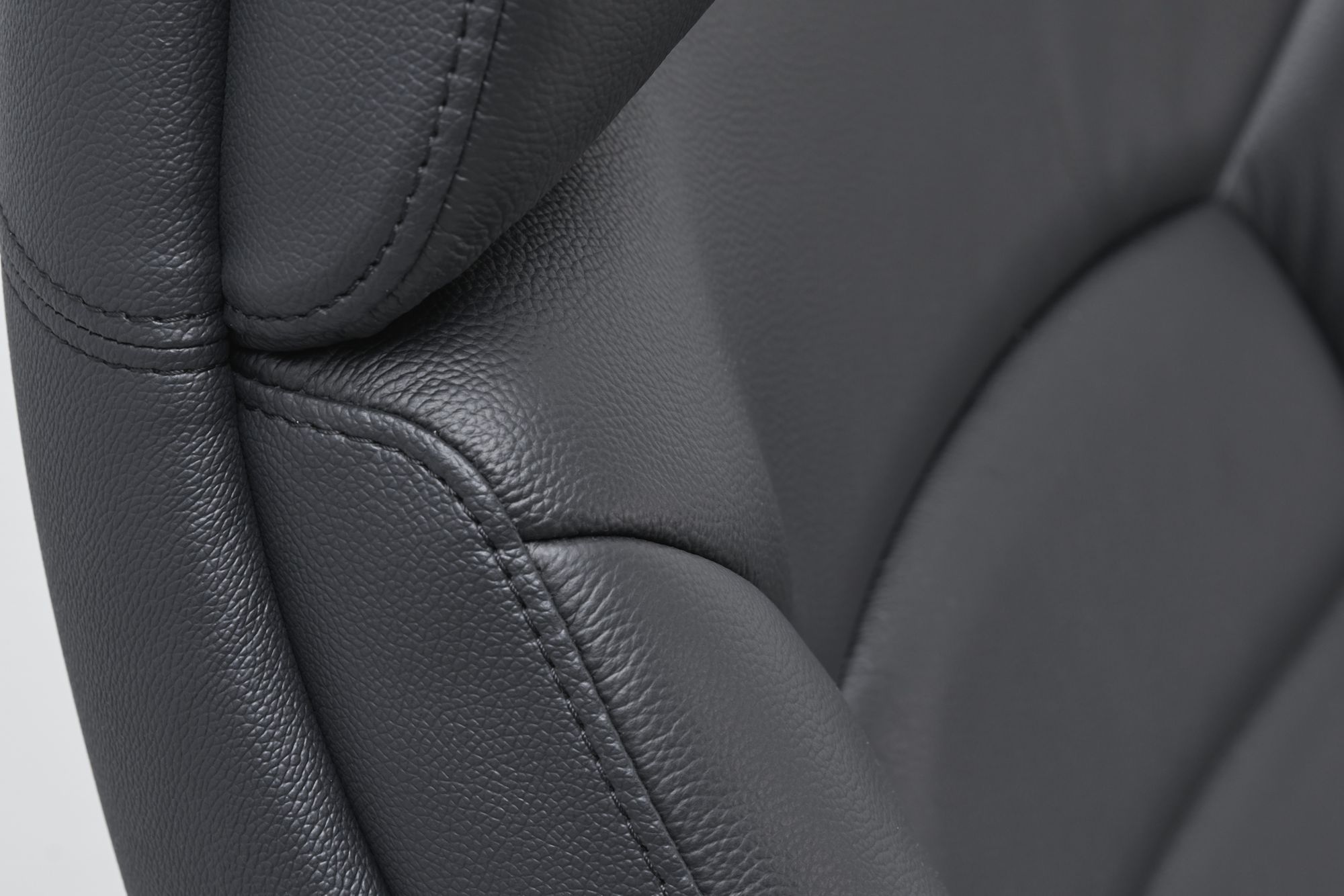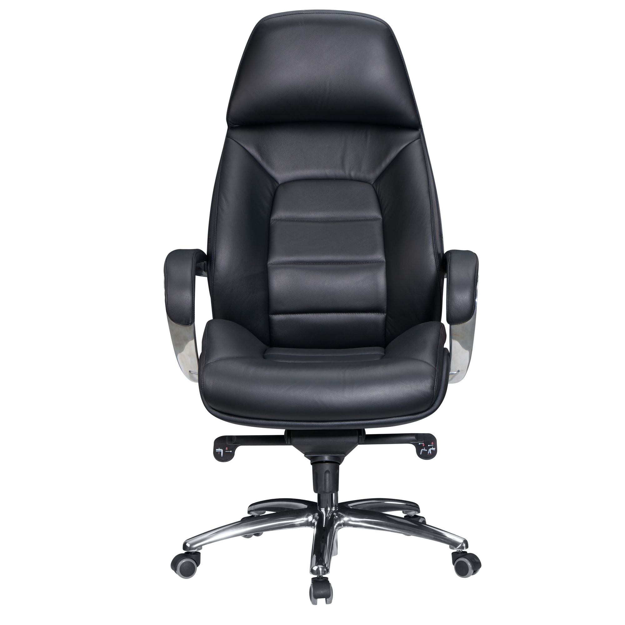 Poltrona da ufficio design XXL in vera pelle nera, progettata per un uso professionale intensivo fino a 8 ore. Seduta e schienale ergonomici ampi, braccioli in alluminio lucidato e meccanismo di inclinazione multitasking a tre punti con supporto lombare integrato per postura e stabilità ottimali.
