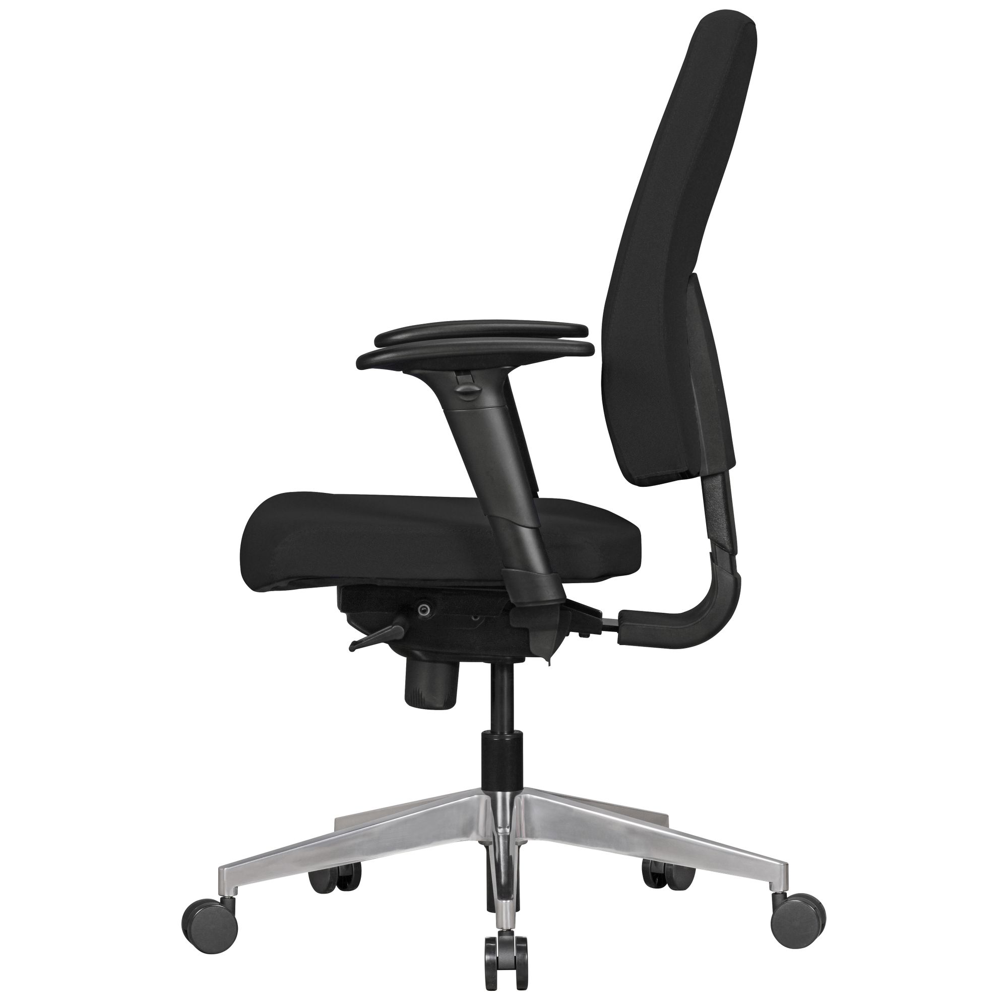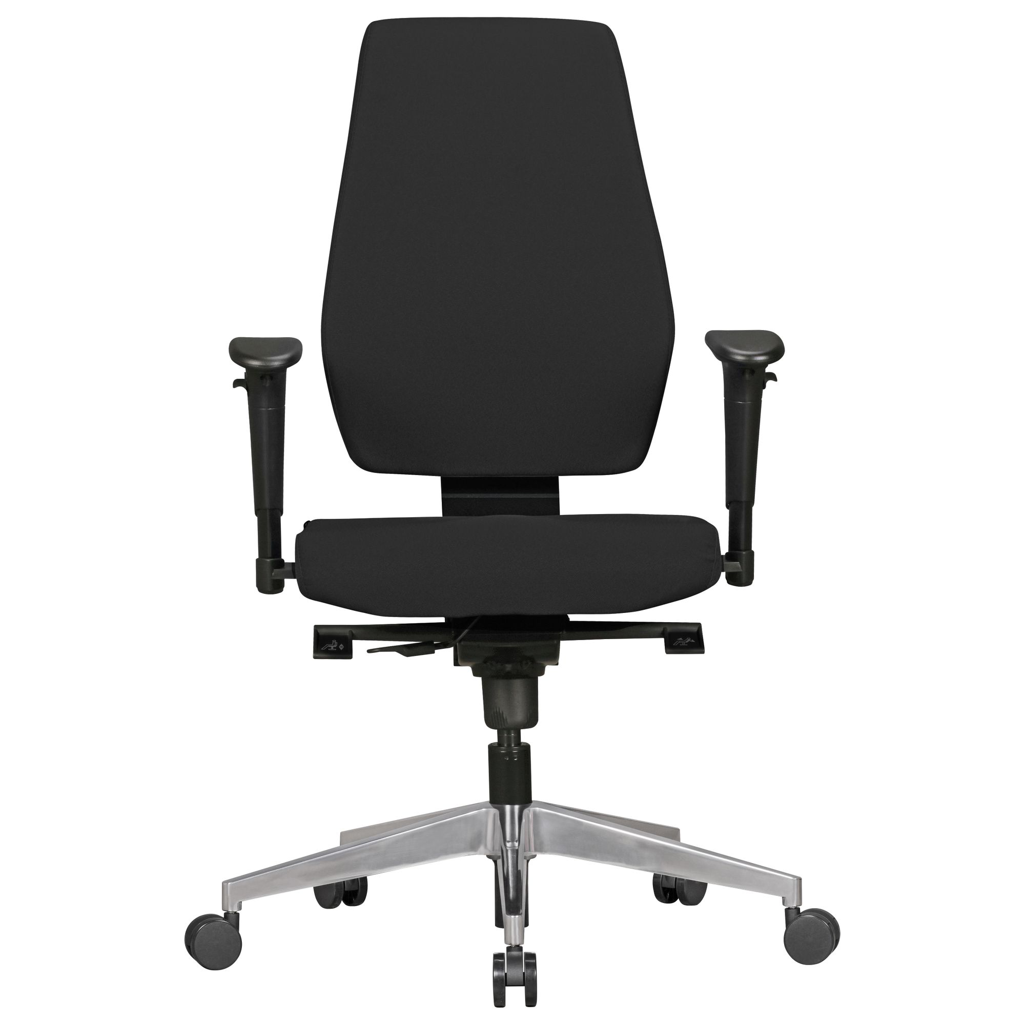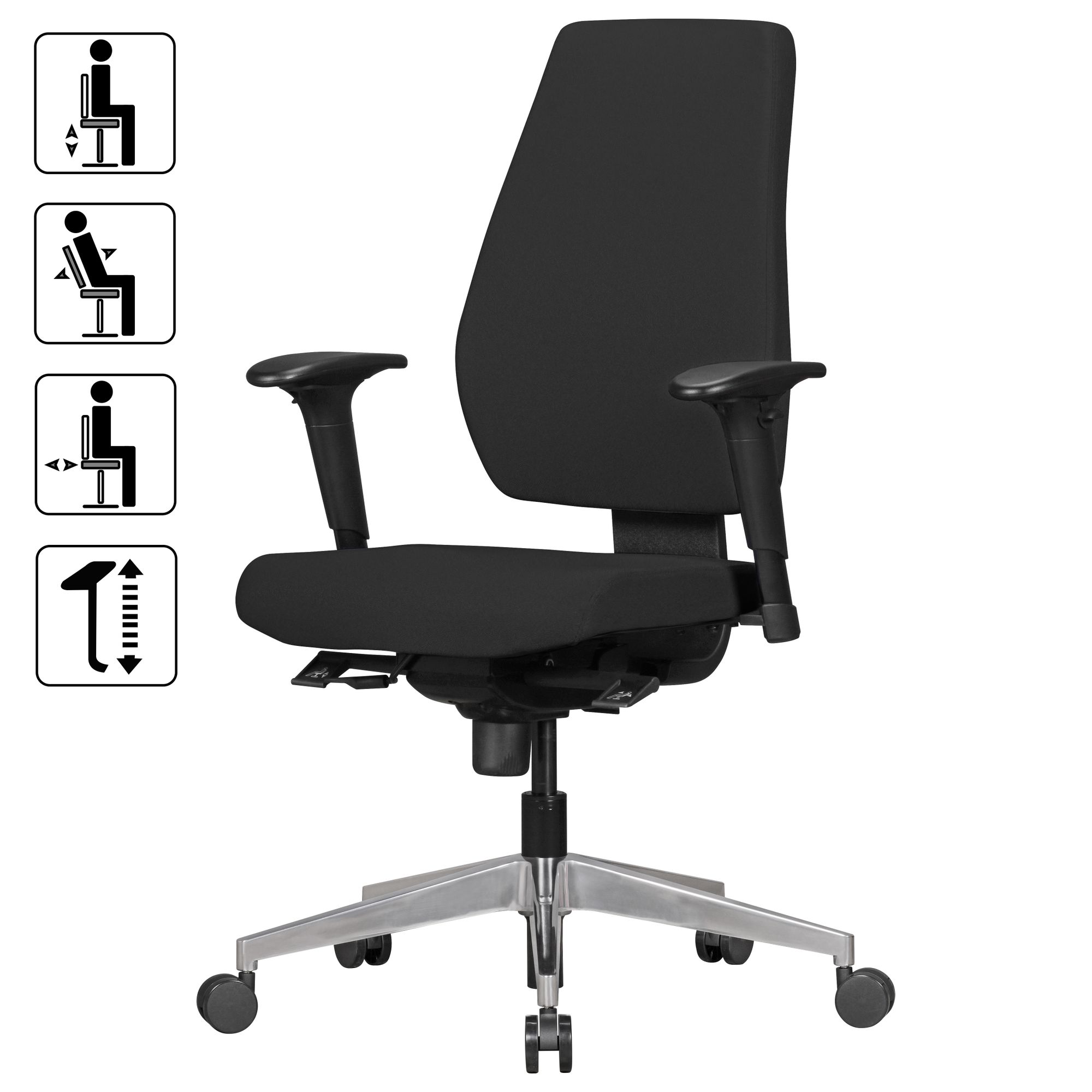 La sedia da ufficio DARIUS garantisce comfort ottimale grazie al design ergonomico e all’imbottitura in schiuma PU ad alta densità (65 kg/m³). Il tessuto nero è resistente all’abrasione (100.000 cicli) e adatto per un uso intensivo fino a 8 ore al giorno. La robusta base in alluminio argentato con diametro di 70 cm assicura stabilità eccellente.