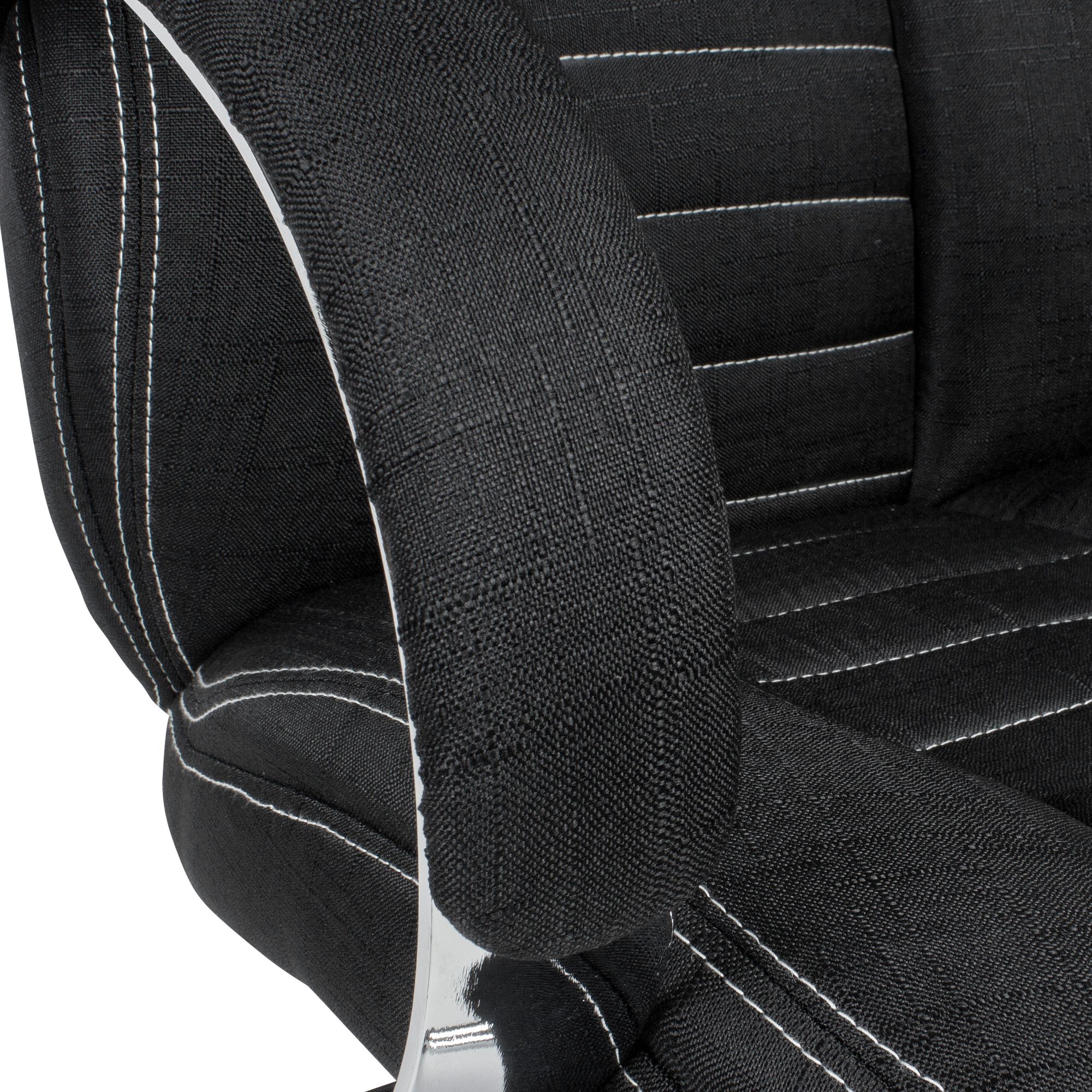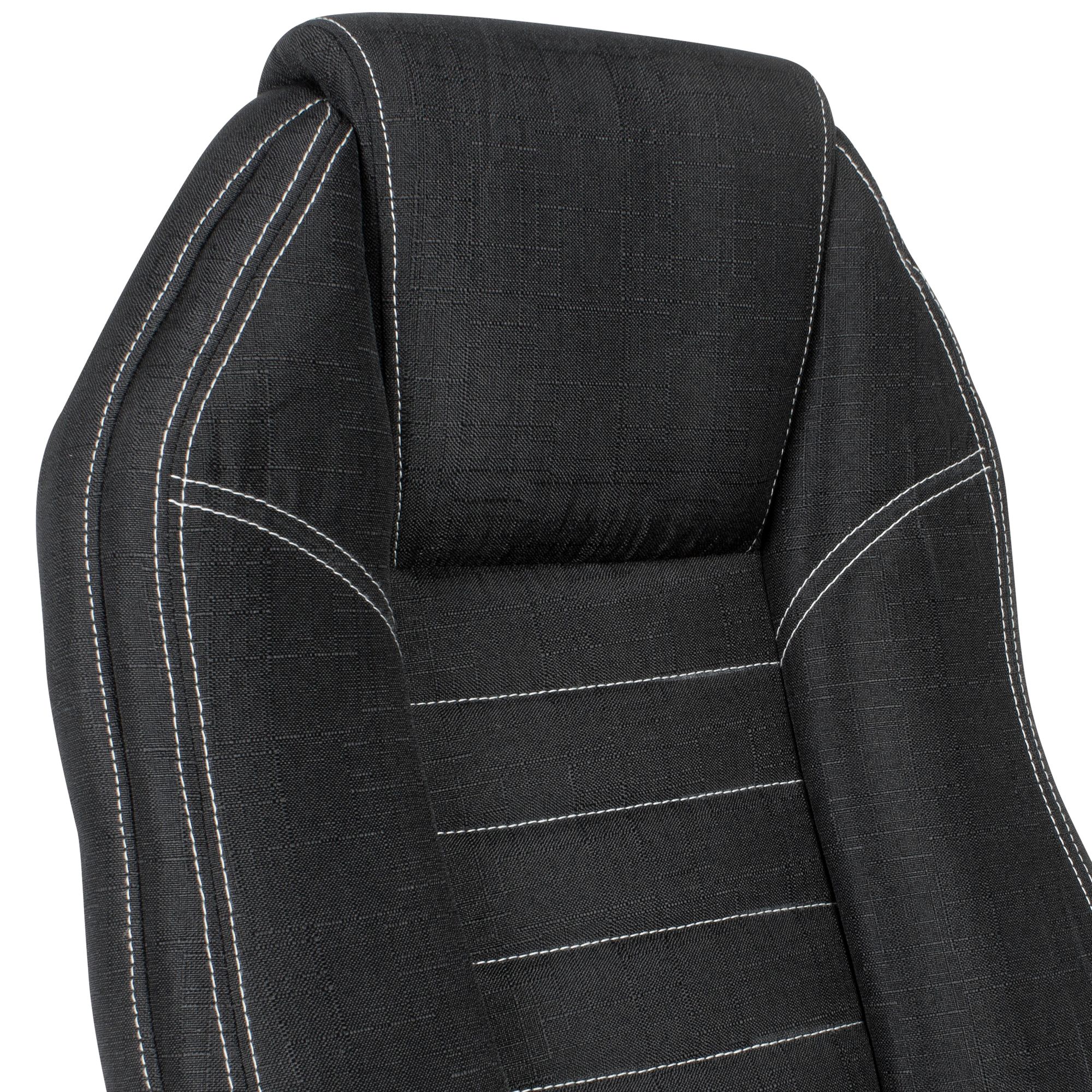 Questa sedia da ufficio girevole in tessuto nero effetto jeans offre un comfort elevato grazie all'imbottitura soffice e alle cuciture bianche a contrasto. Altezza regolabile e schienale alto garantiscono una postura ergonomica.