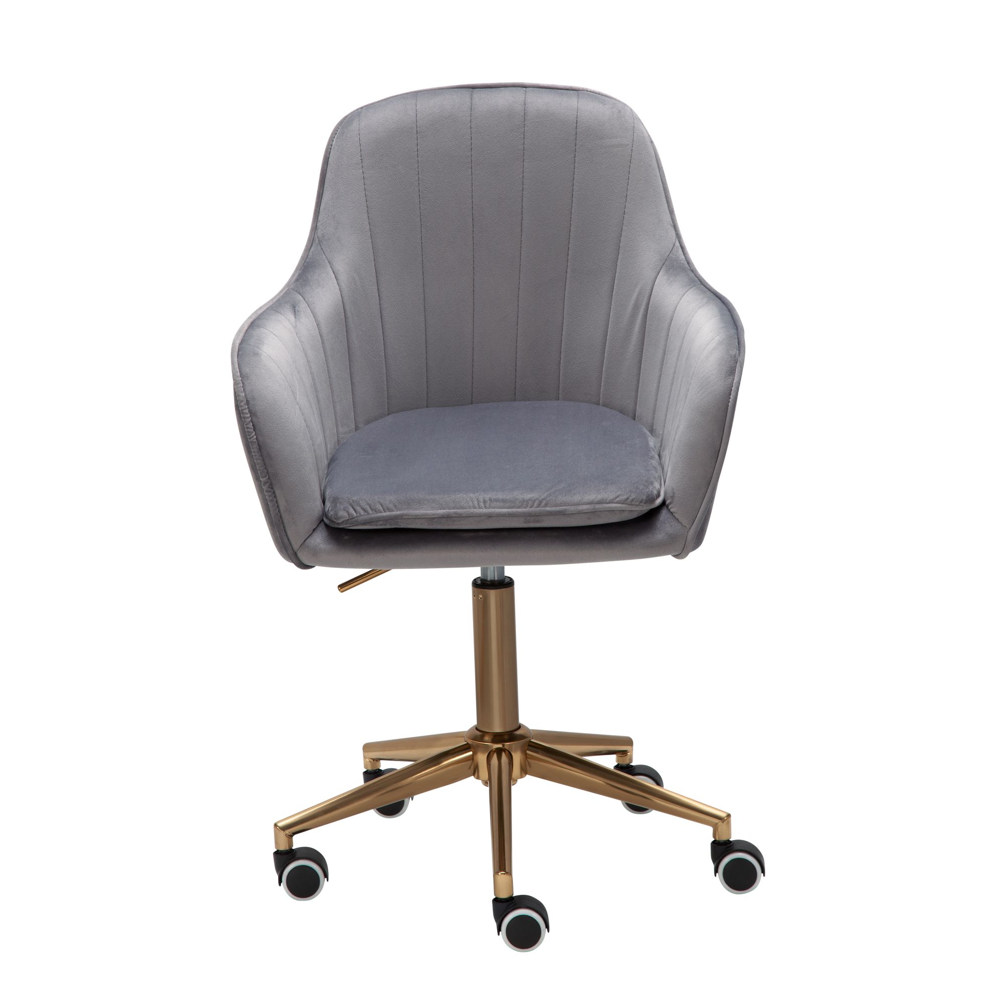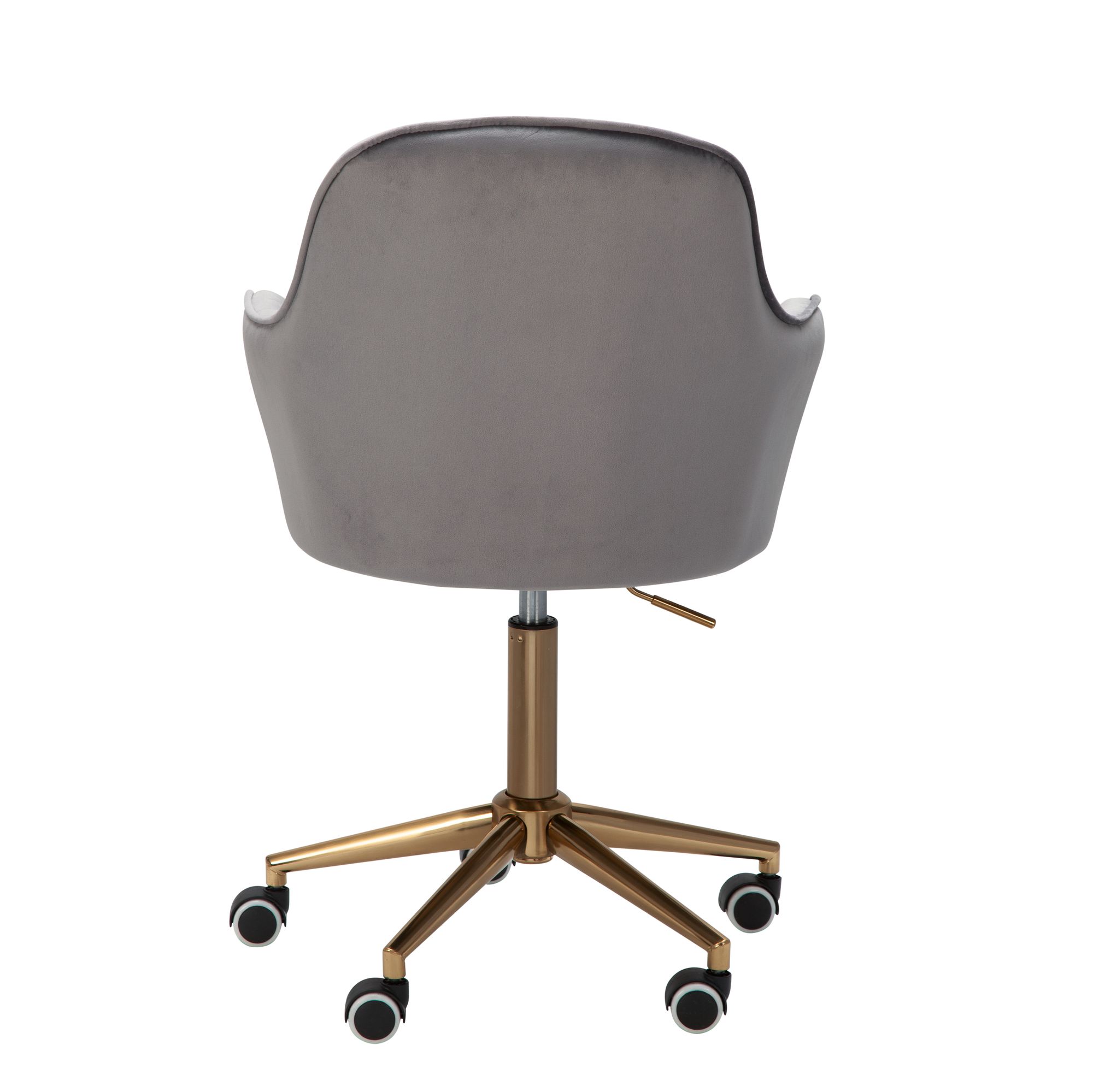Sedia da ufficio moderna in velluto grigio con sedile ergonomico per massimo comfort. La base metallica dorata aggiunge un tocco elegante. Ideale per spazi compatti, regolabile in altezza (43-63 cm) e supporta fino a 120 kg.