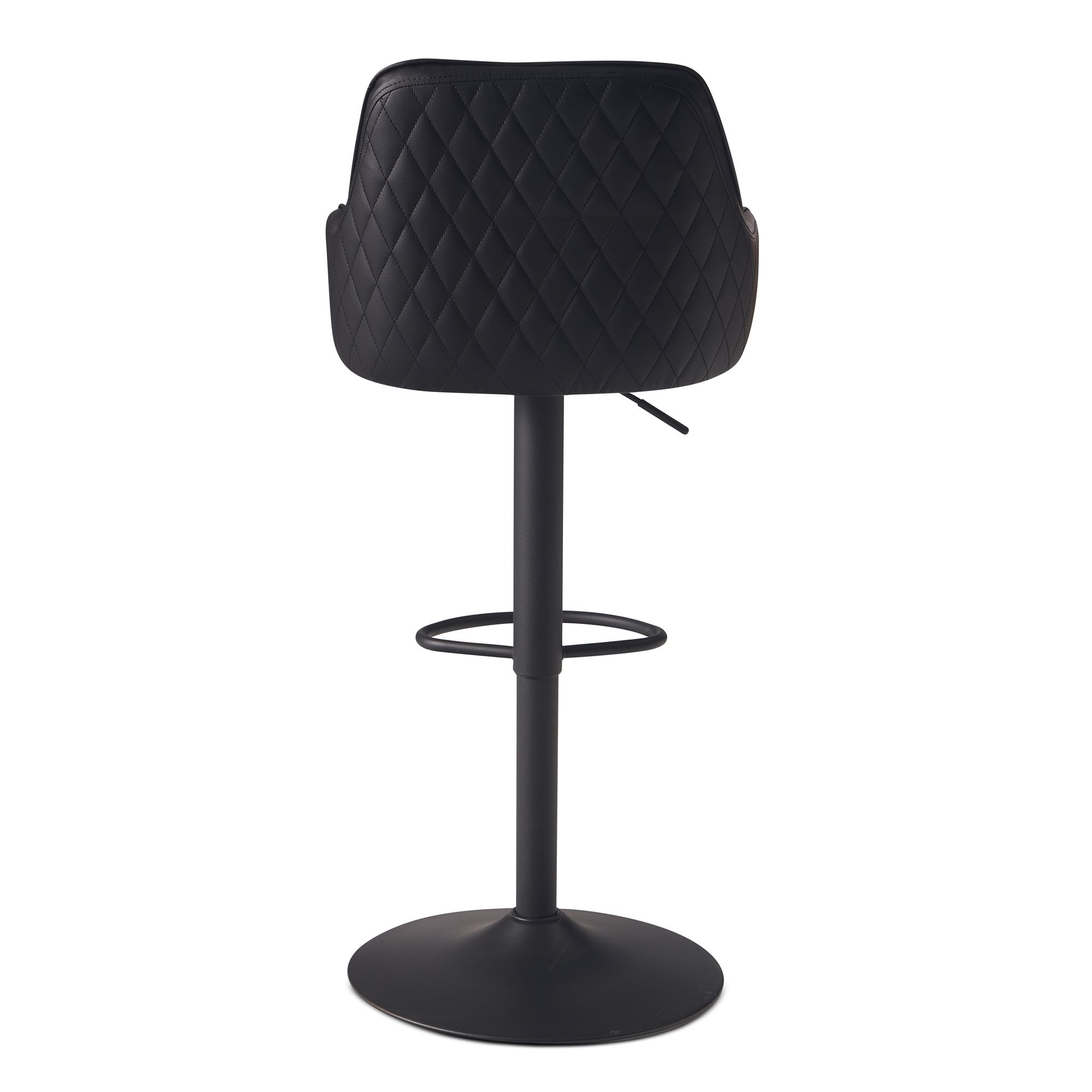 Questo sgabello da bar nero in ecopelle unisce stile contemporaneo e praticità, con altezza regolabile da 86 a 106 cm. La scocca ergonomica con cuciture a rombi su braccioli e schienale offre seduta confortevole. La base a trombetta in metallo garantisce durabilità ed eleganza.