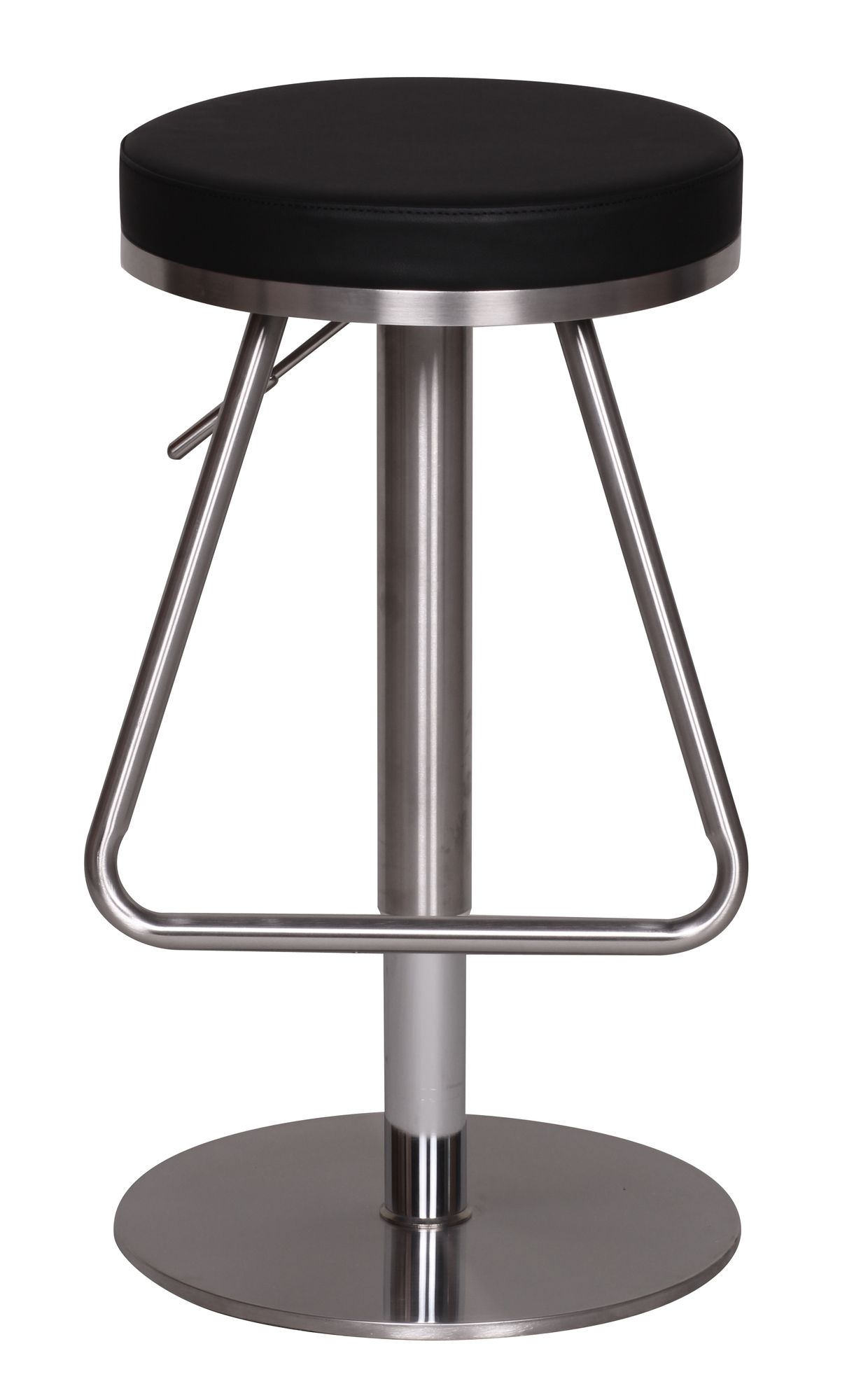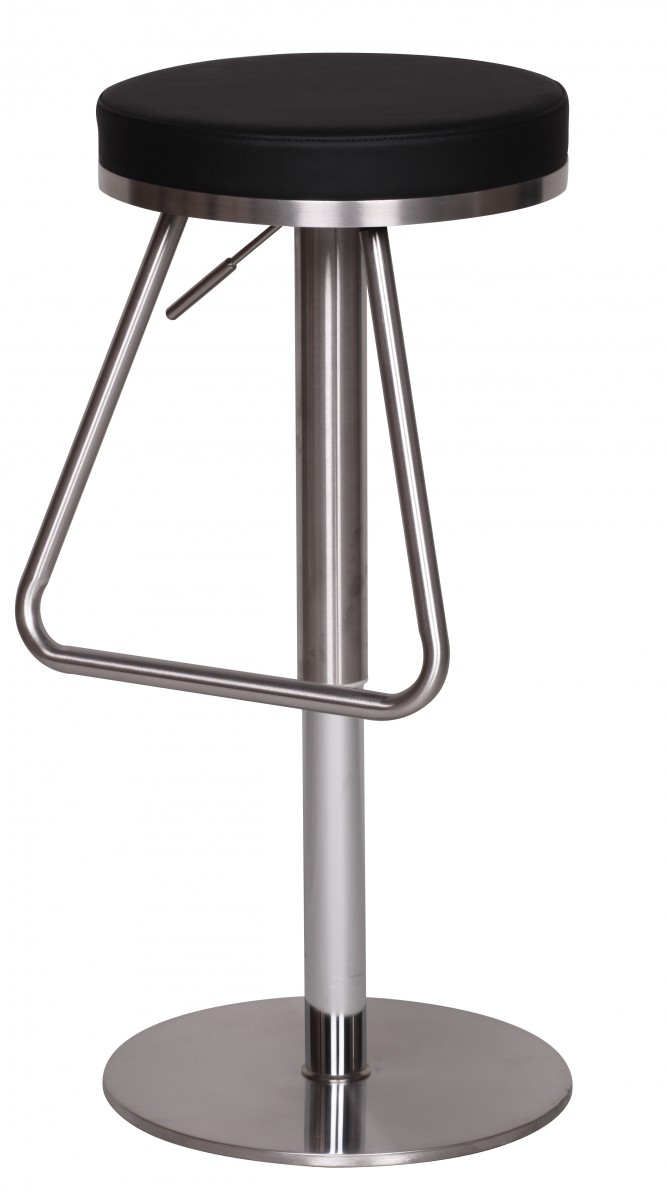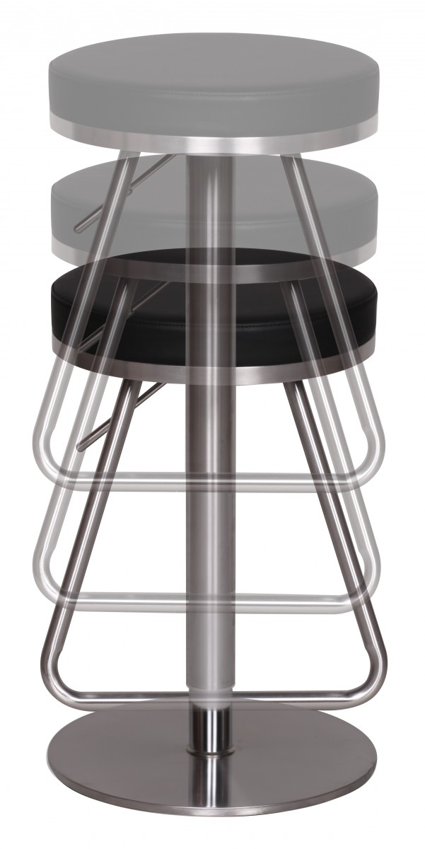 Questo sgabello da bar moderno unisce design raffinato e comfort ottimale con altezza seduta regolabile da 54 a 79 cm. La seduta rotonda e ampiamente imbottita in ecopelle nera è incorniciata da un elegante anello in acciaio inox cromato.