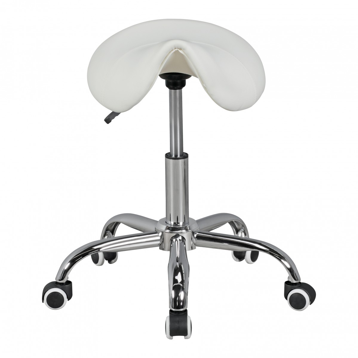 Lo sgabello a sella MENTON bianco unisce eleganza e comfort con la sua seduta in ecopelle bianca e base robusta in alluminio. Perfetto per ambienti professionali che richiedono mobilità.