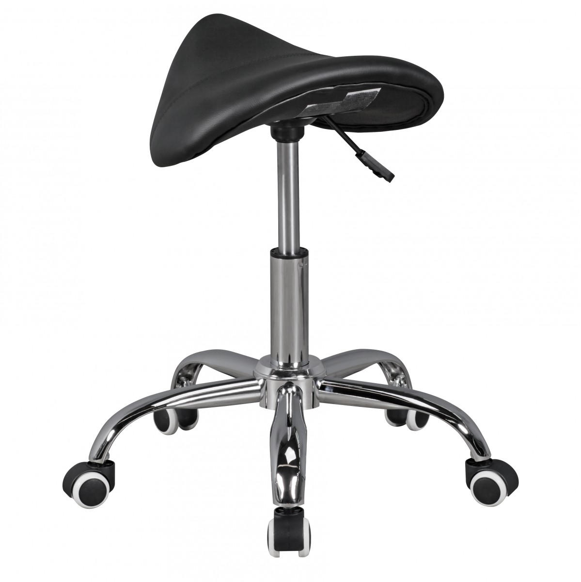Lo sgabello a sella MENTON nero offre comfort e stabilità ottimali grazie alla sua seduta in ecopelle e alla robusta base in alluminio. La forma a sella consente libertà di movimento delle gambe, ideale per il lavoro.