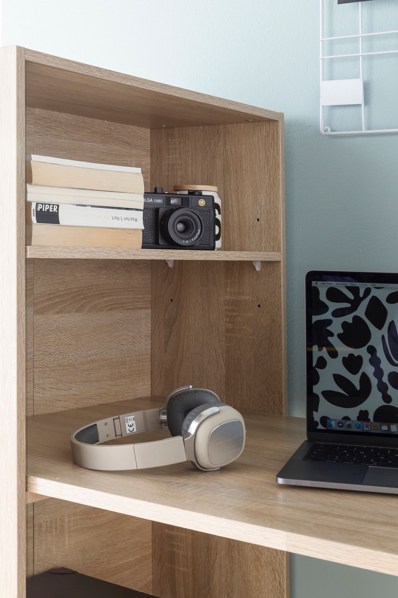 Scrivania contemporanea con finitura Sonoma in pannelli di particelle, che unisce toni caldi a un design funzionale con ripiani integrati per massimizzare lo spazio di archiviazione.