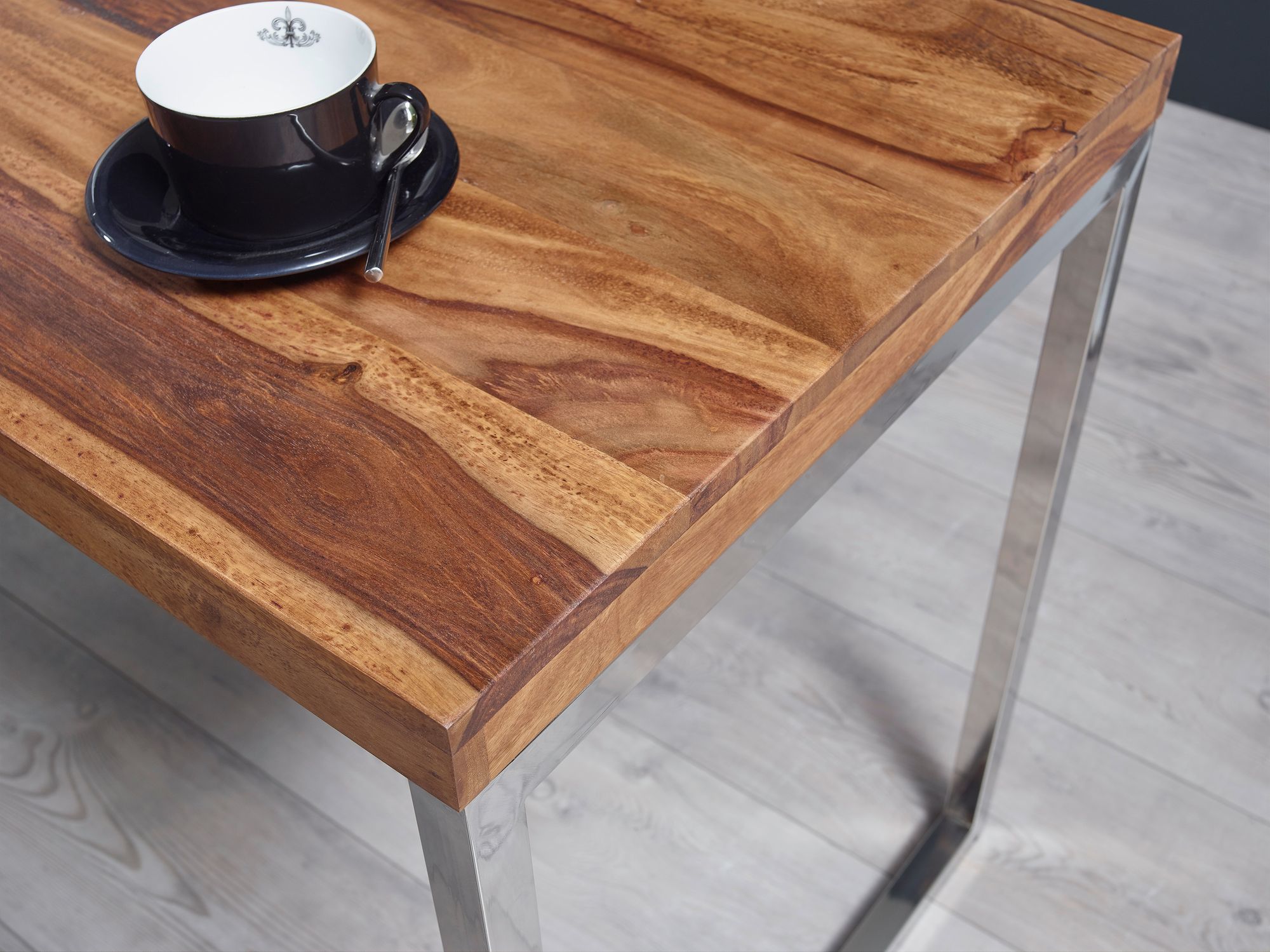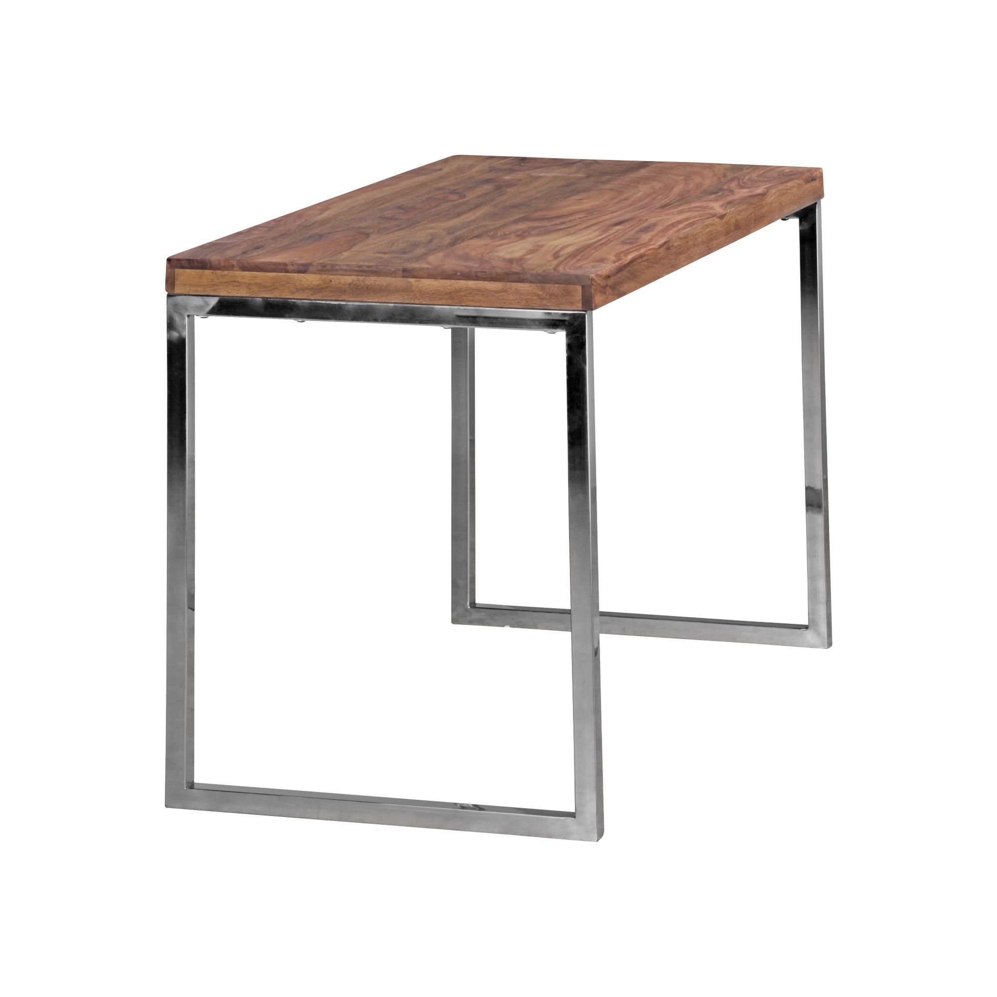 La scrivania GUNA in legno massello Sheesham unisce eleganza e robustezza per il tuo spazio di lavoro. La superficie in legno naturale con finitura trasparente e le gambe in metallo cromato creano un contrasto caldo e moderno. Progettata in stile country, offre un'area comoda e ottimizzata.