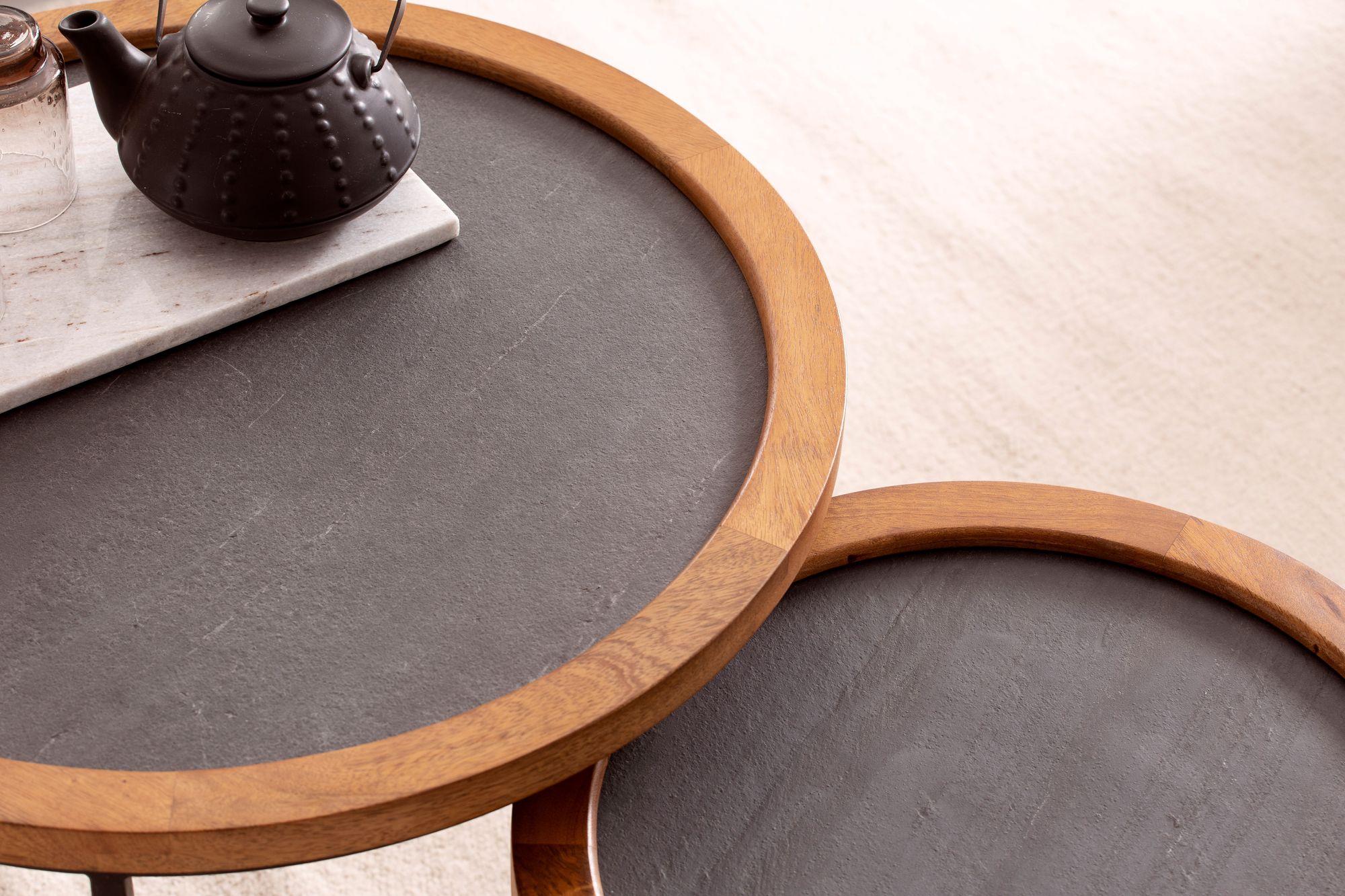 Aggiungi un tocco naturale e moderno al tuo soggiorno con questo set di 2 tavolini da caffè rotondi dal design elegante, che combina bordi in legno massello di mango e piani effetto pietra. I bordi in legno mostrano venature calde e naturali, mentre i piani antracite con superficie 3D offrono stabilità grazie alla struttura in metallo nero.