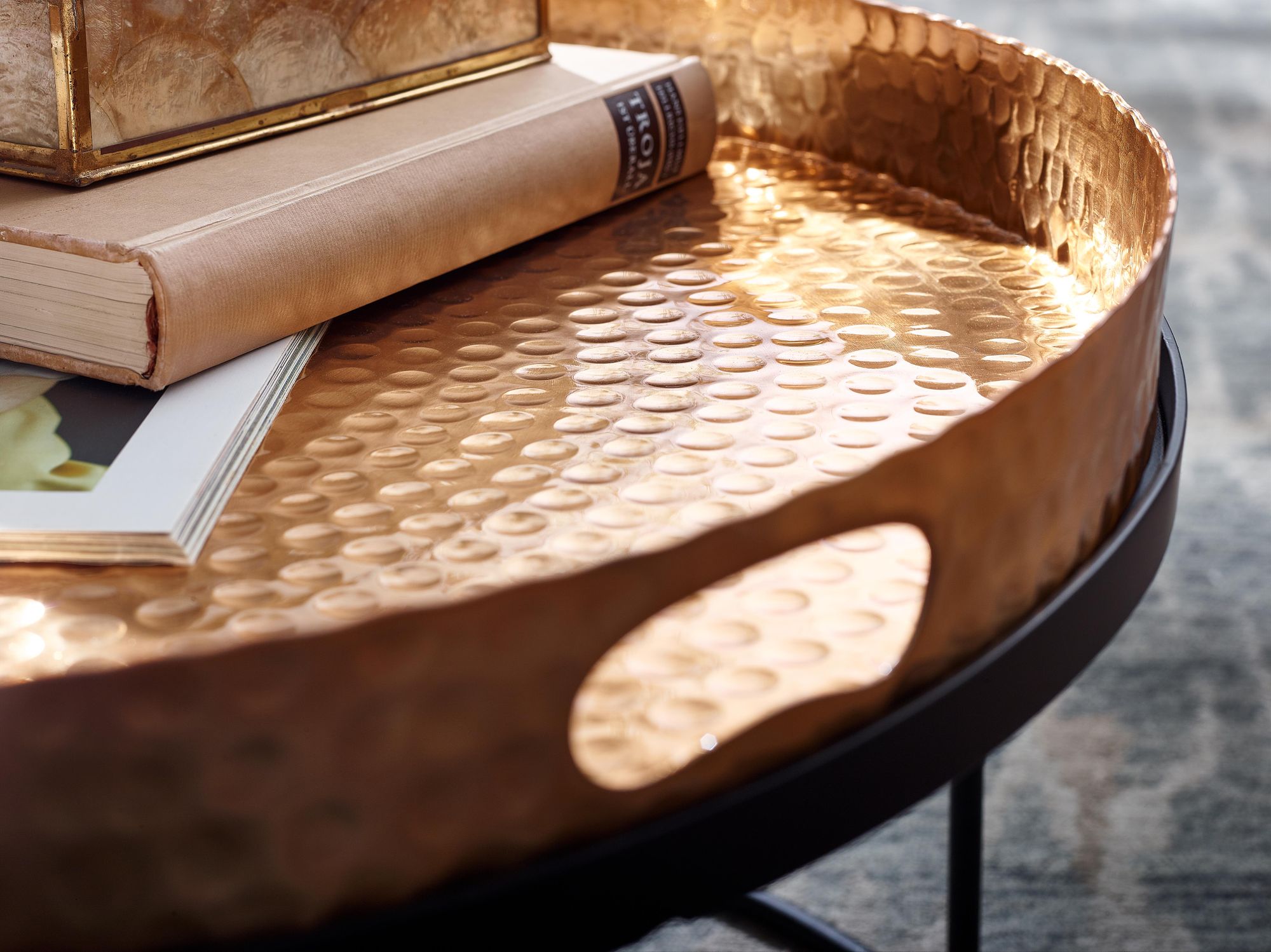 Elevate lo stile del soggiorno con questo set di 2 tavolini da caffè rotondi in metallo oro e nero. I piani in alluminio laccato oro presentano una texture martellata per un aspetto contemporaneo e raffinato. Le strutture in acciaio nero offrono solidità e durata nel tempo.