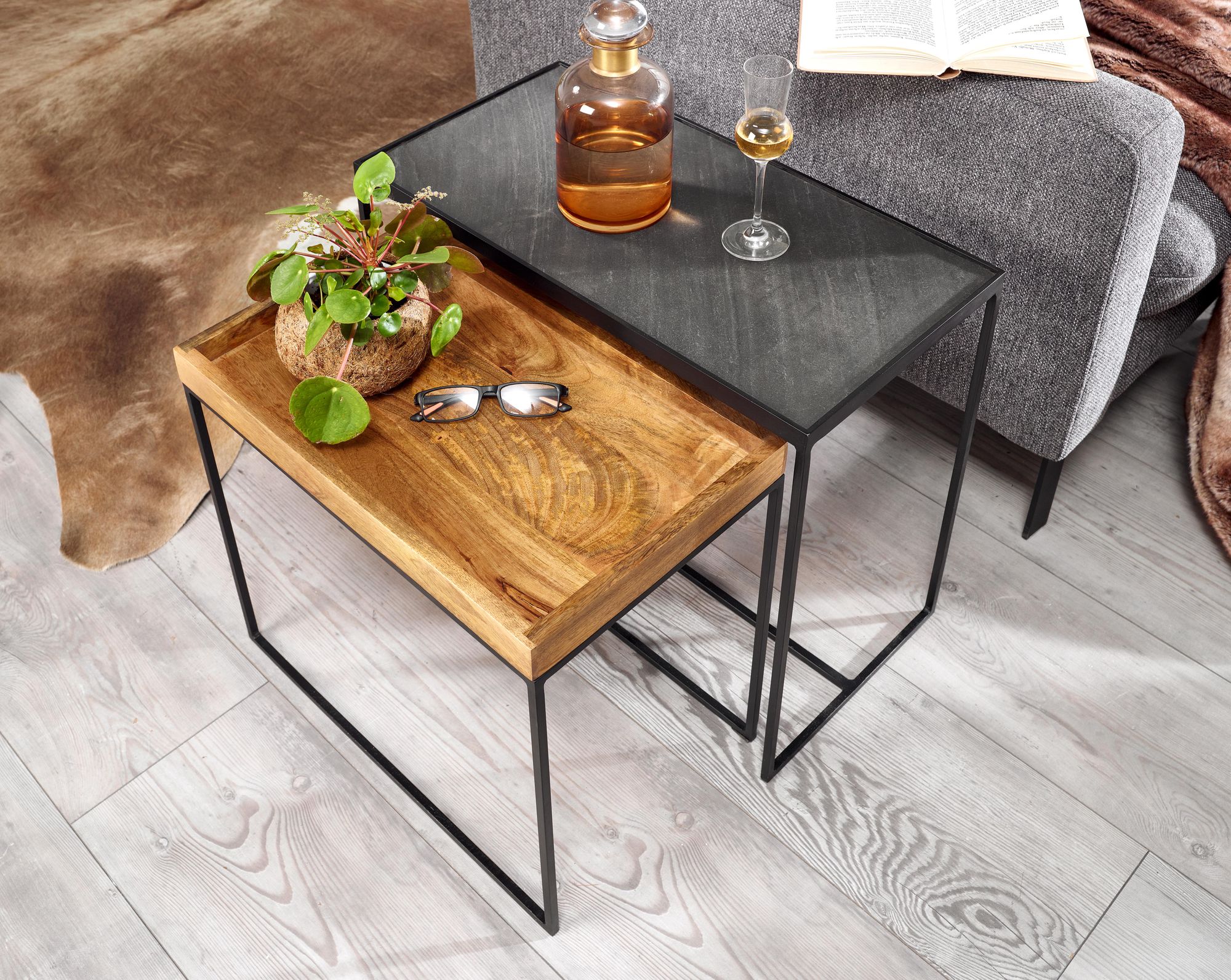Aggiungi uno stile industriale deciso al tuo soggiorno con questo set di due tavolini rettangolari che abbinano il legno massello di mango con una finitura effetto pietra. Ogni tavolo è lavorato a mano e presenta una superficie 3D unica e una solida struttura in metallo nero.