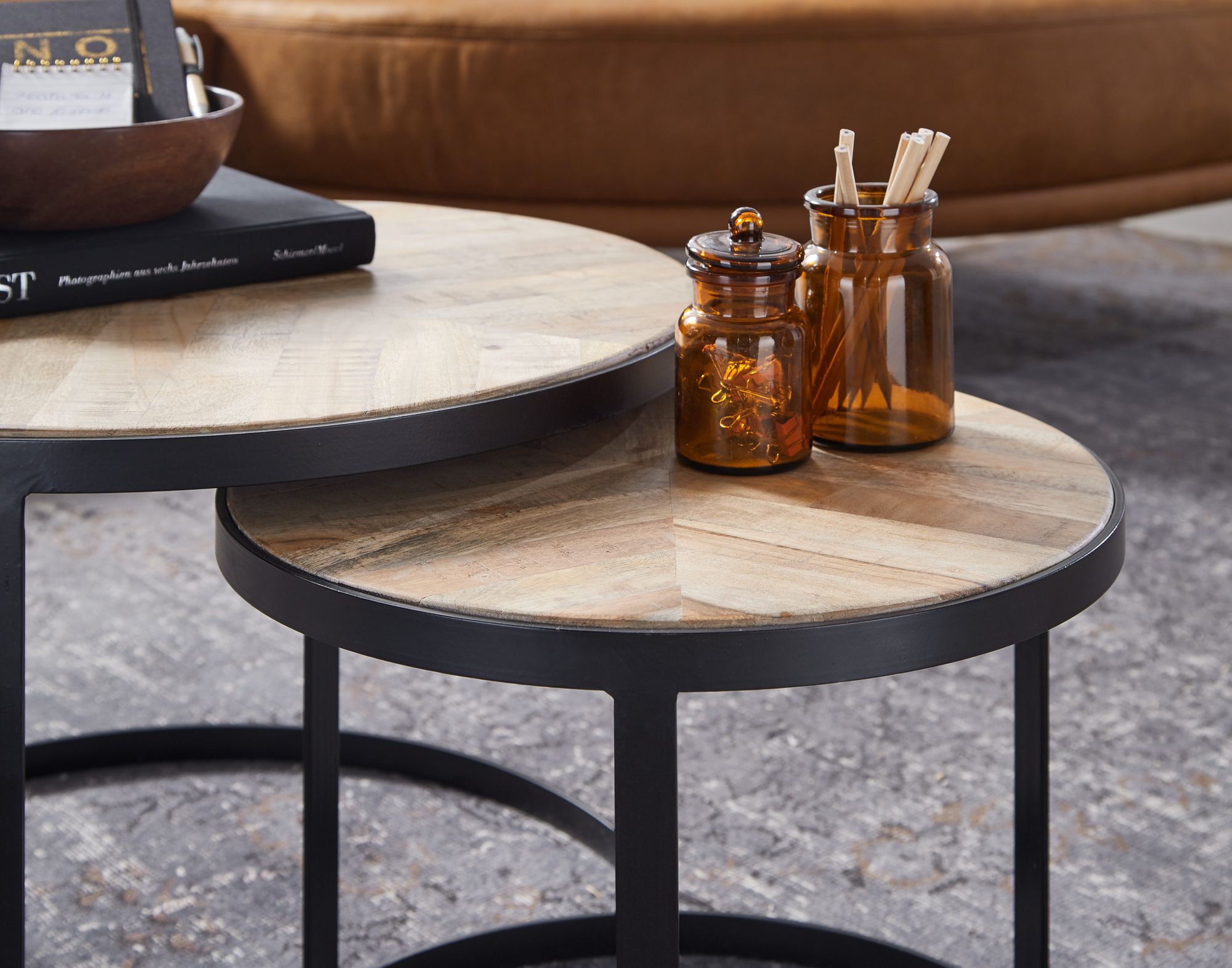 Set di due tavolini rotondi dal design industriale moderno che unisce con eleganza legno massello e gambe in metallo nero. Ogni tavolo è realizzato a mano, garantendo un pezzo unico con leggere variazioni naturali.