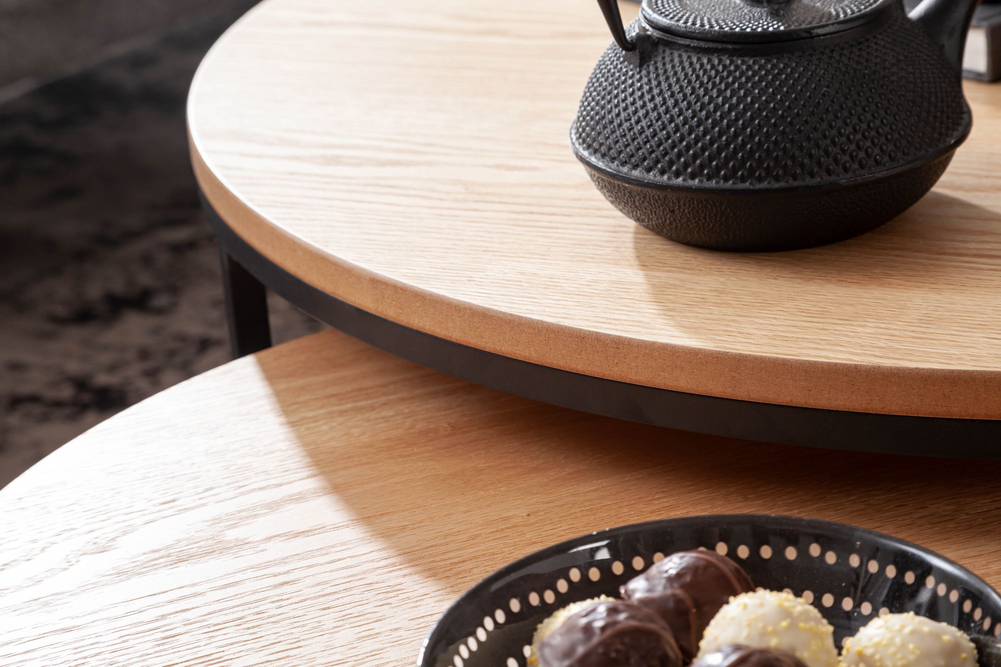 Aggiungi calore e stile naturale alla tua casa con questo set di 2 tavolini rotondi in MDF con impiallacciatura rovere e struttura in metallo nero opaco. Il contrasto legno-metallo crea un ambiente moderno e accogliente.