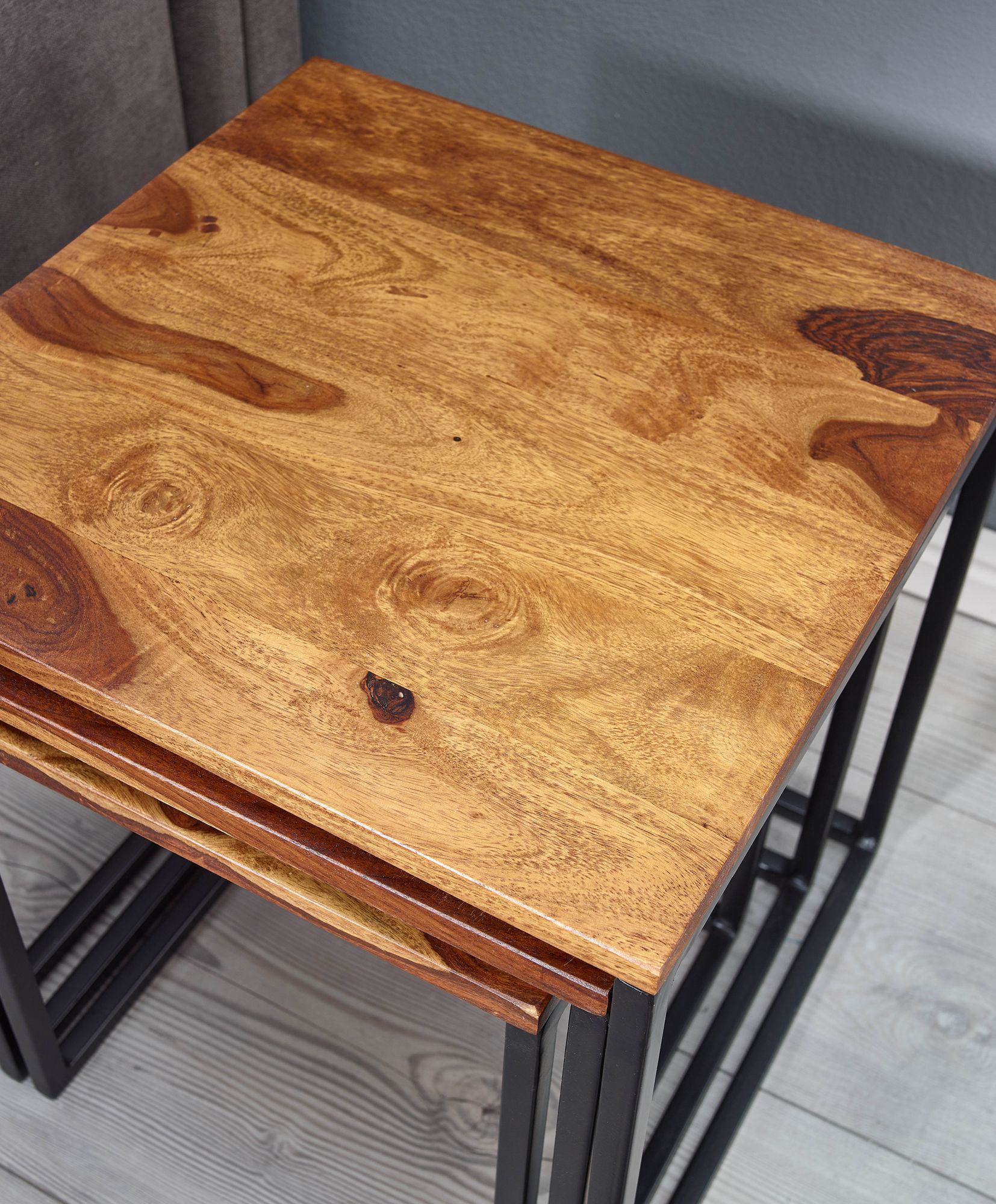 Questo set di tre tavolini in legno massello di Sheesham marrone e metallo nero opaco aggiunge un tocco moderno e pratico al tuo soggiorno. Ogni tavolino presenta una venatura naturale marcata e una struttura metallica robusta.