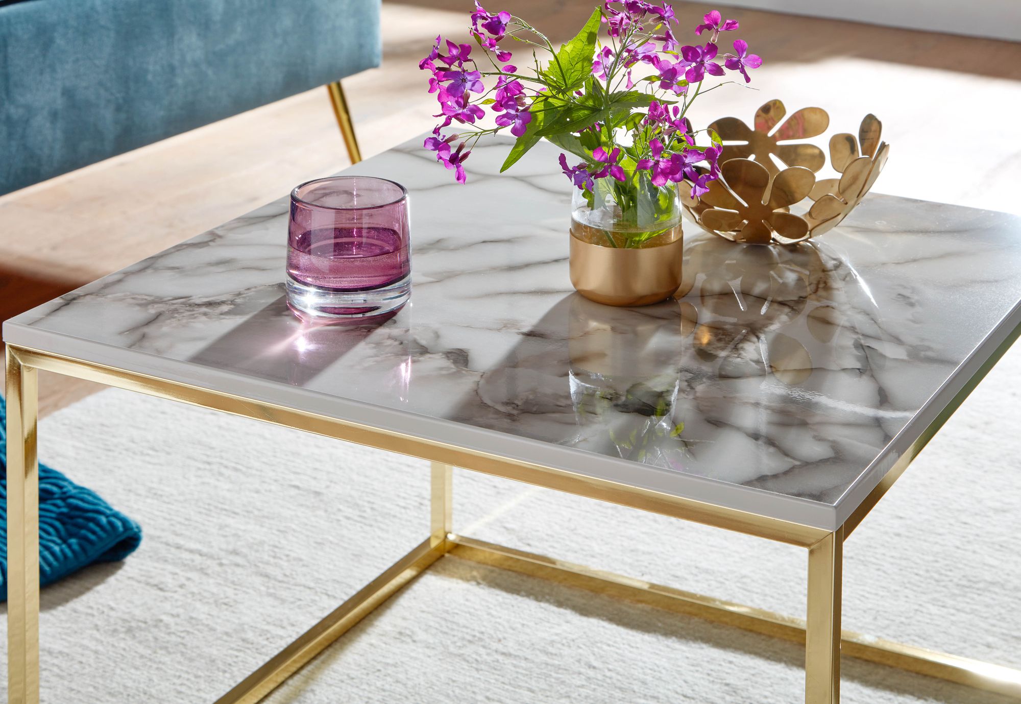Tavolino 60x60x45 cm | Piano in effetto marmo bianco | Struttura metallica dorata