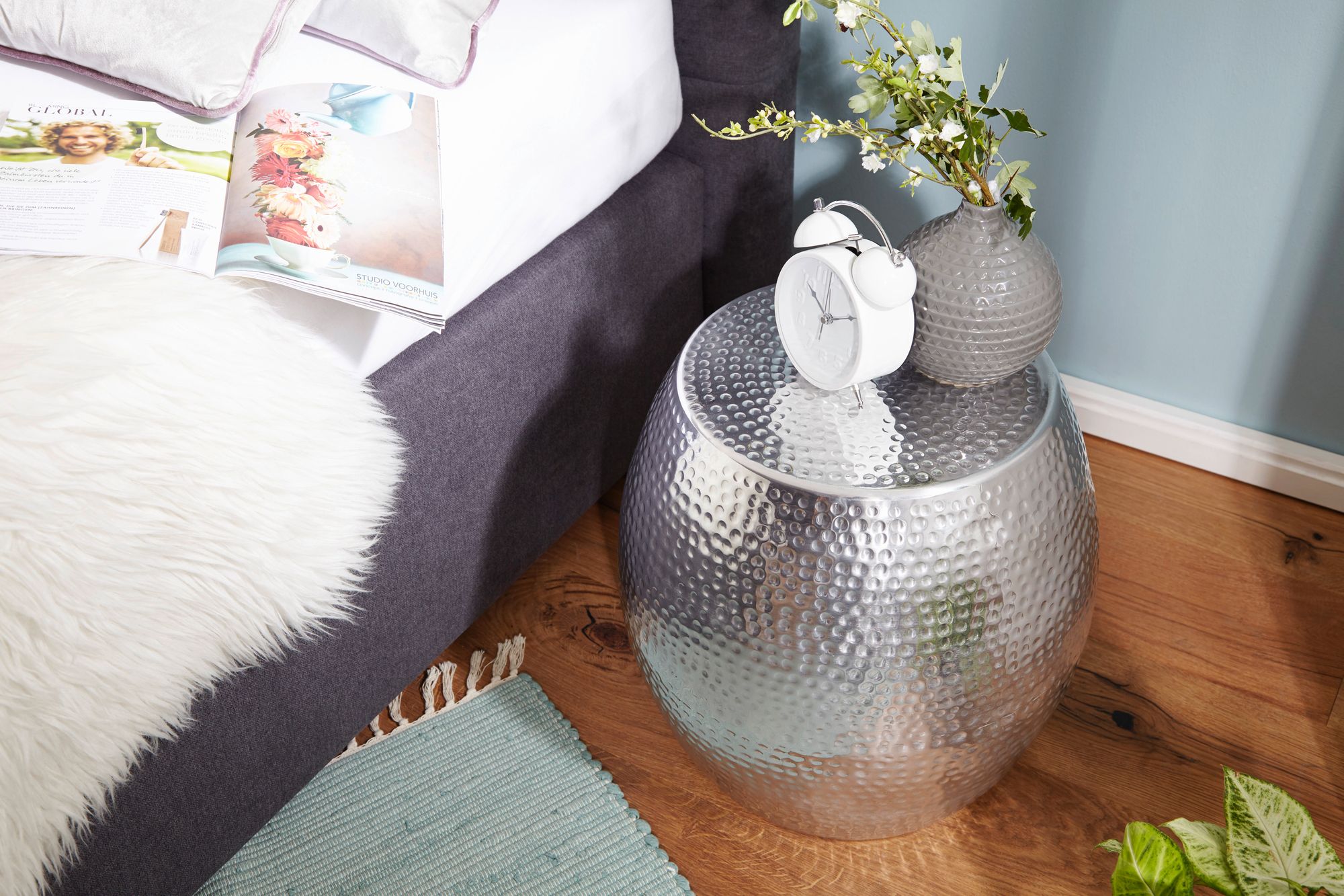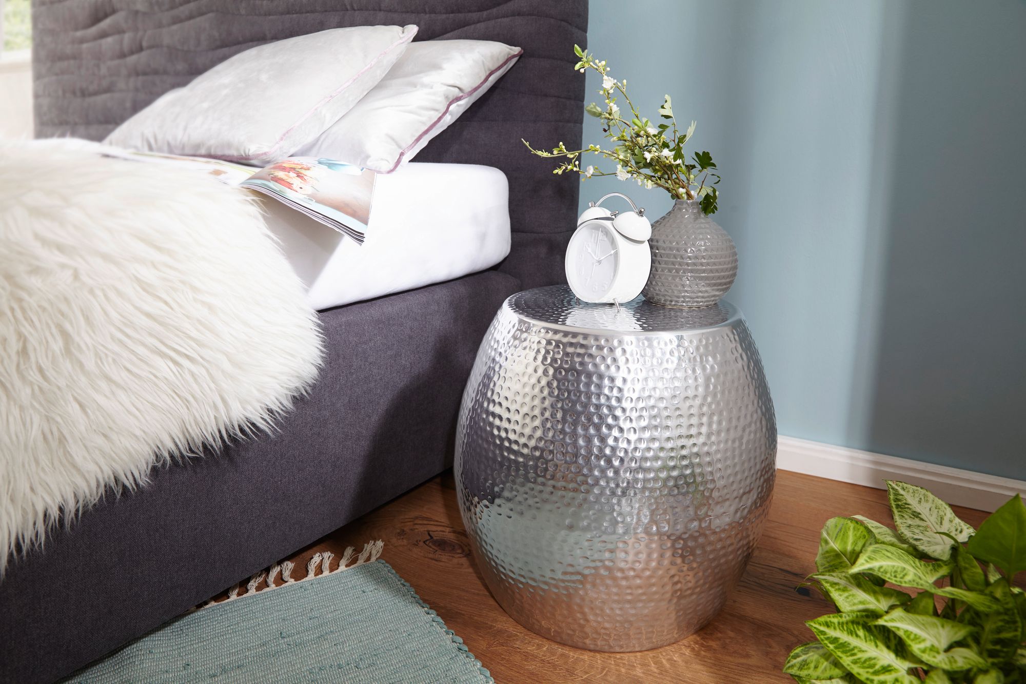 Aggiungi un tocco di eleganza orientale al tuo ambiente con questo tavolino in alluminio argento. La forma rotonda e la splendida texture martellata rendono questo piccolo tavolo un pezzo decorativo unico, realizzato a mano con grande cura.