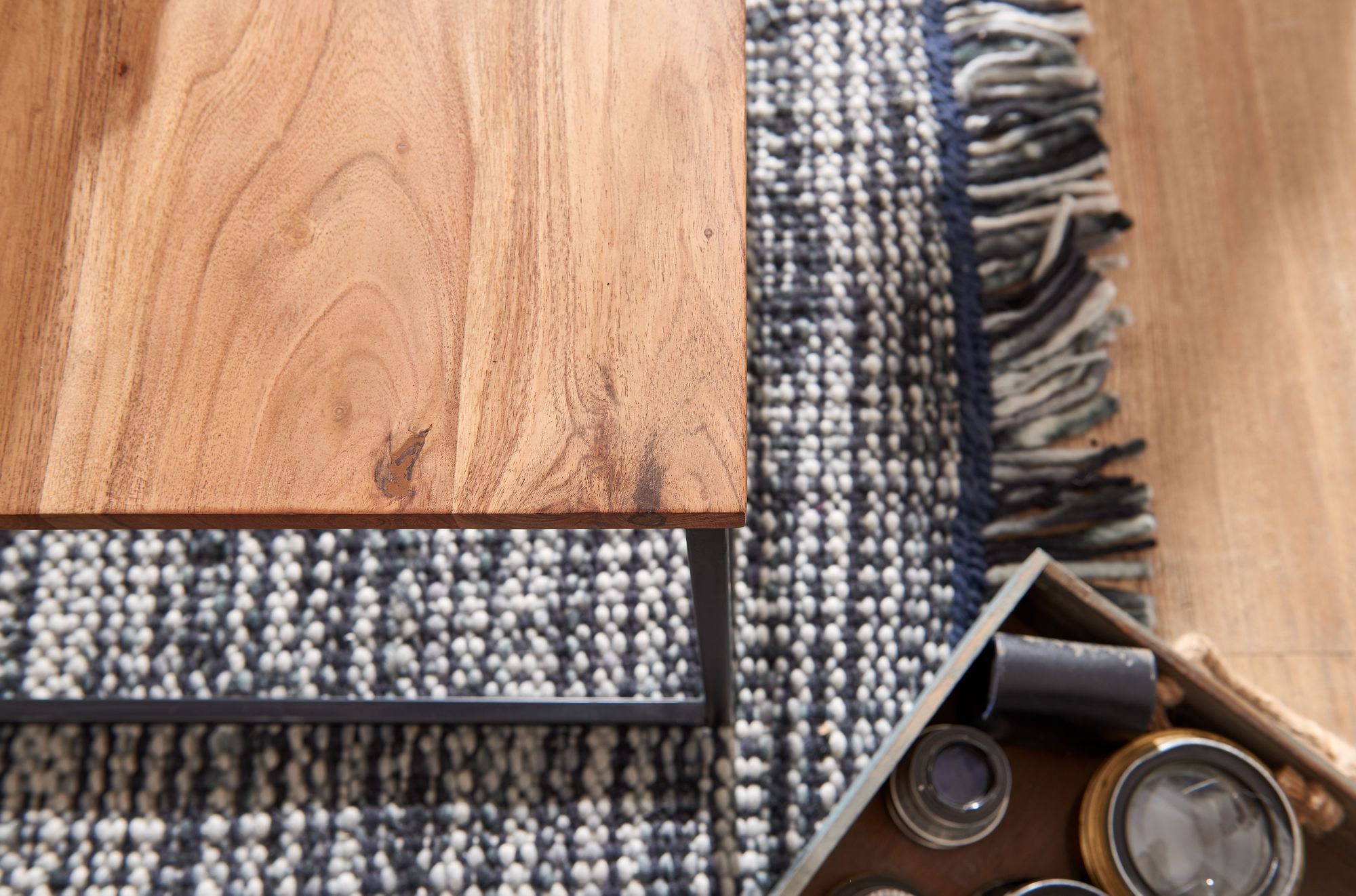 Aggiungi un tocco caldo industriale al tuo soggiorno con questo tavolino basso in legno massello di acacia e metallo nero opaco. La superficie elegante offre ampio spazio per riviste, telecomandi e bevande, integrandosi perfettamente in interni moderni.