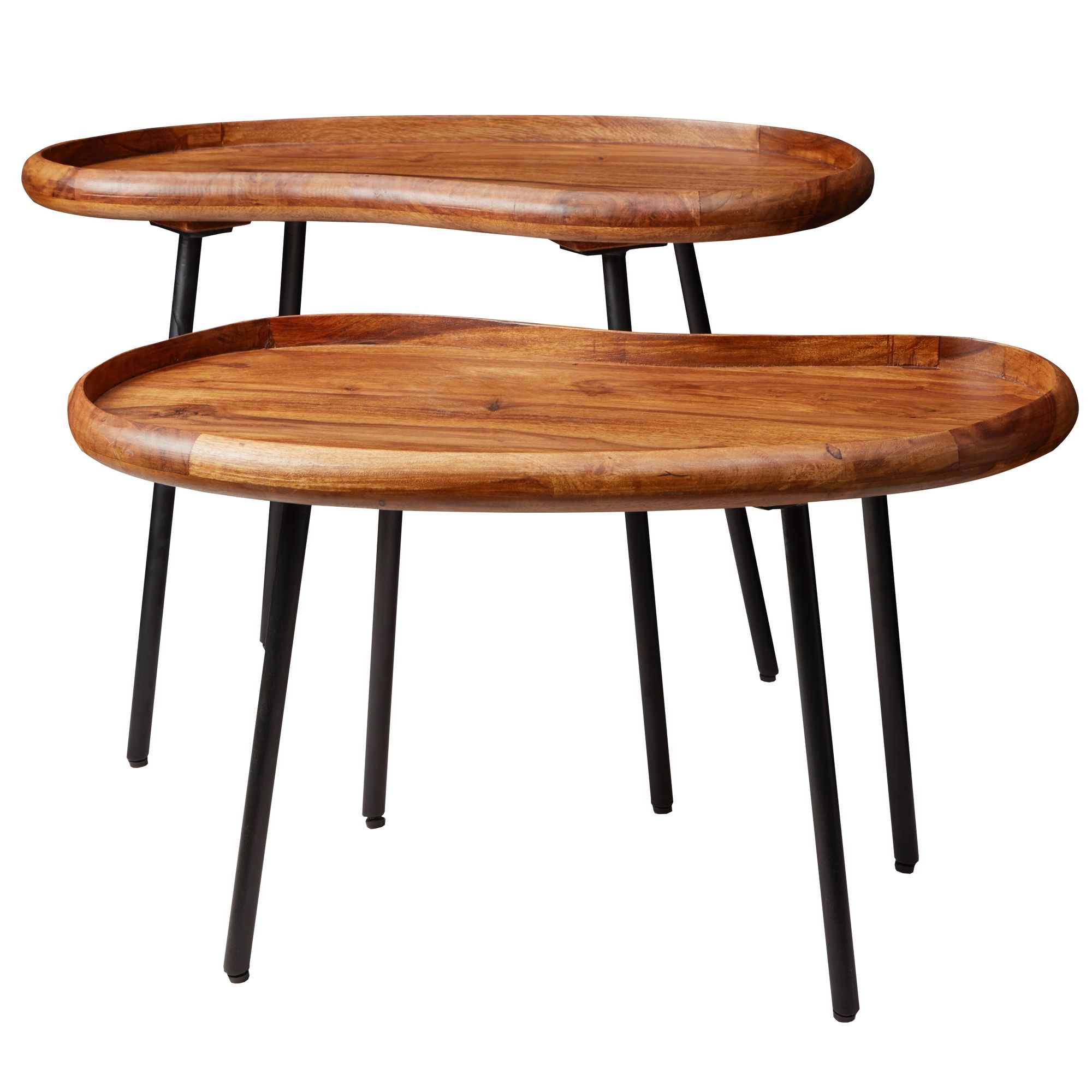 Aggiungi un tocco retrò al tuo soggiorno con questo tavolino in legno massello di Sheesham. Il piano a forma di rene misura 71x42x40 cm ed è supportato da gambe in metallo nero per una stabilità duratura.