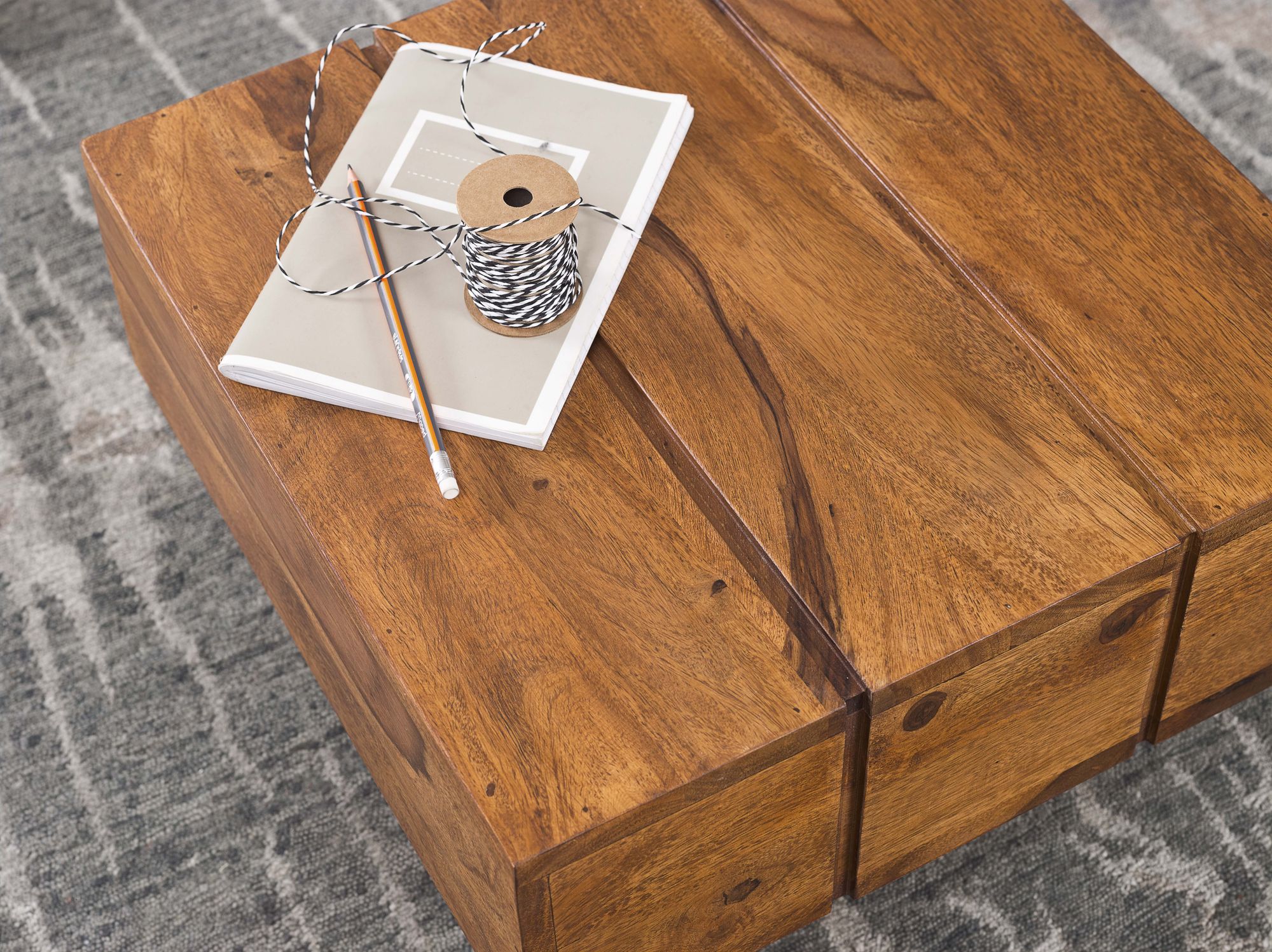 Questo tavolino quadrato in legno massello di Sheesham è ideale per angoli, soggiorno o come supporto versatile. La finitura laccata chiara valorizza la bellissima e unica venatura del legno di rosa.