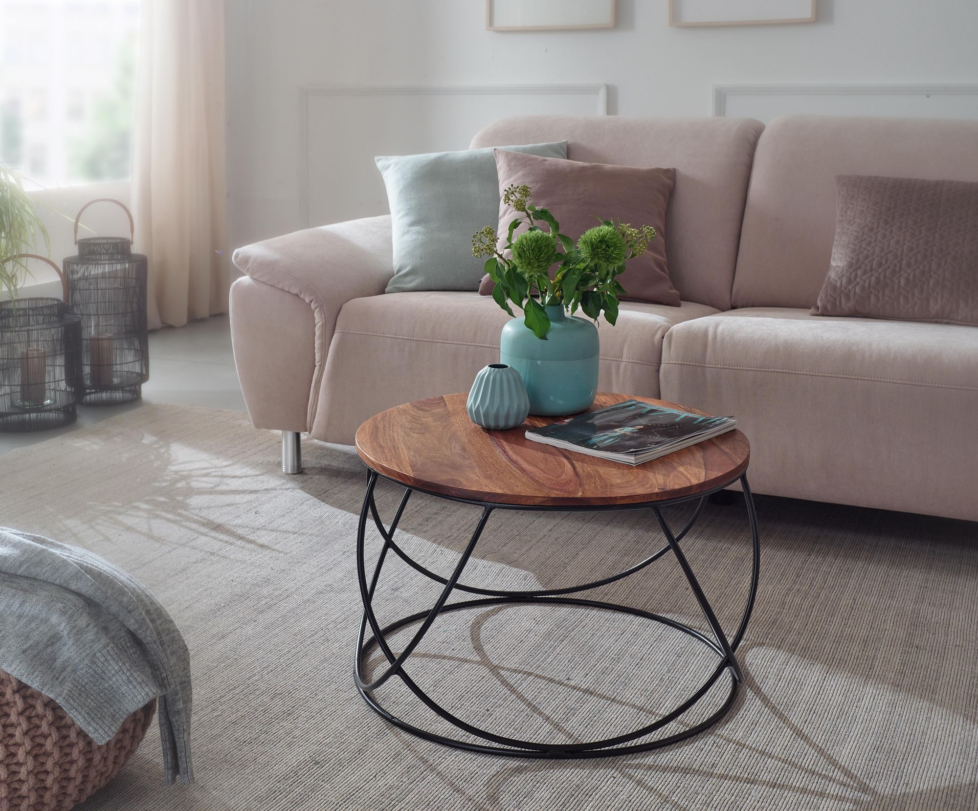 Tavolino in legno massello Sheesham marrone 60x40x60 cm | Design industriale rotondo con struttura in metallo