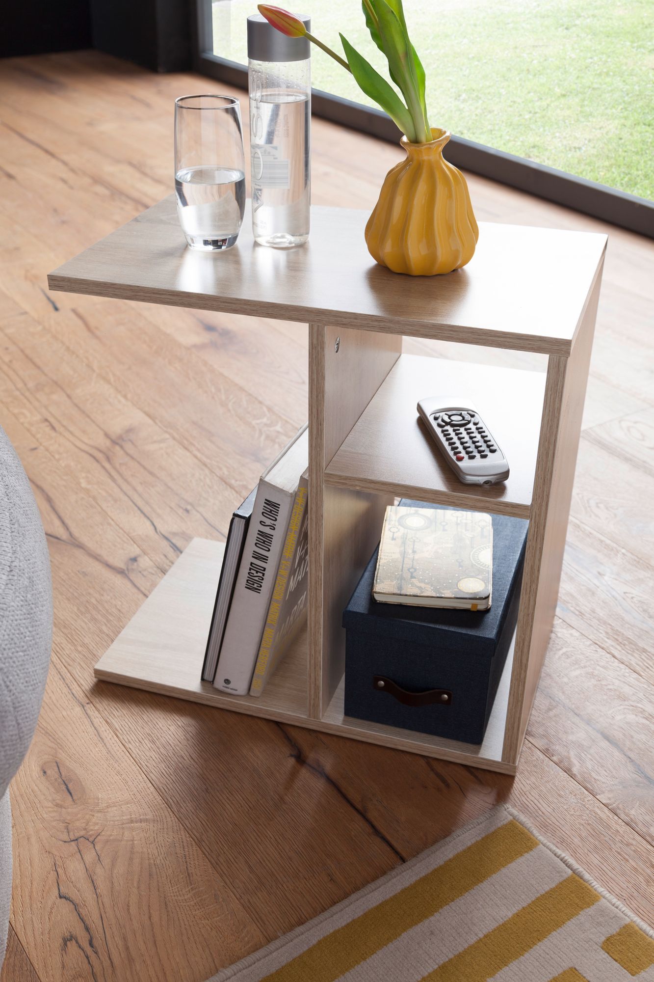 Questo piccolo tavolino da appoggio dal design moderno è ideale per il soggiorno. Dispone di due pratici ripiani per telecomandi, riviste e oggetti personali, mentre la superficie ampia è perfetta per bevande e snack.