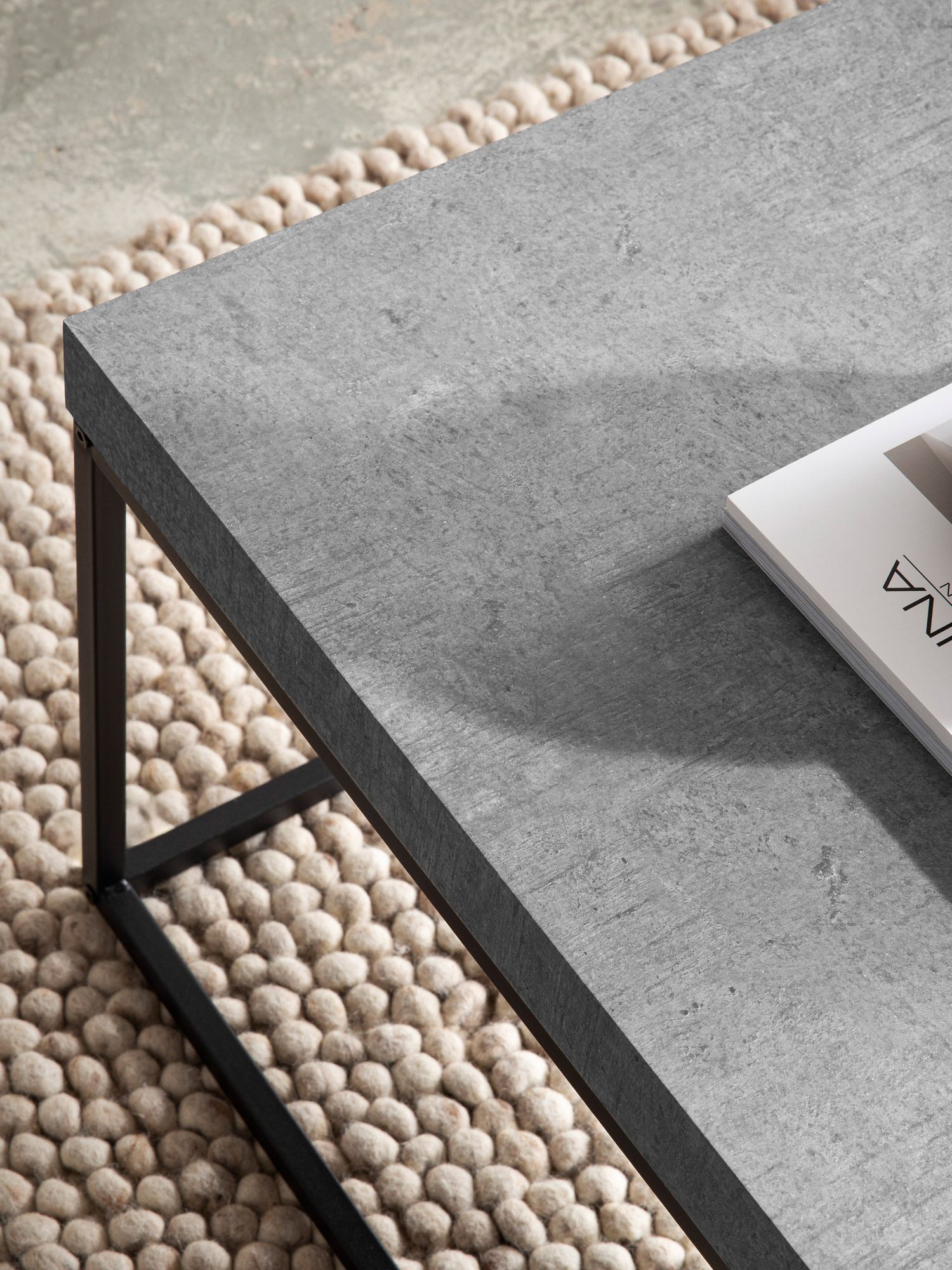 Tavolino minimalista con grande piano di MDF laminato grigio effetto cemento, ideale per appoggiare o esporre oggetti. La struttura in metallo nero verniciato a polvere garantisce robustezza e supporto.