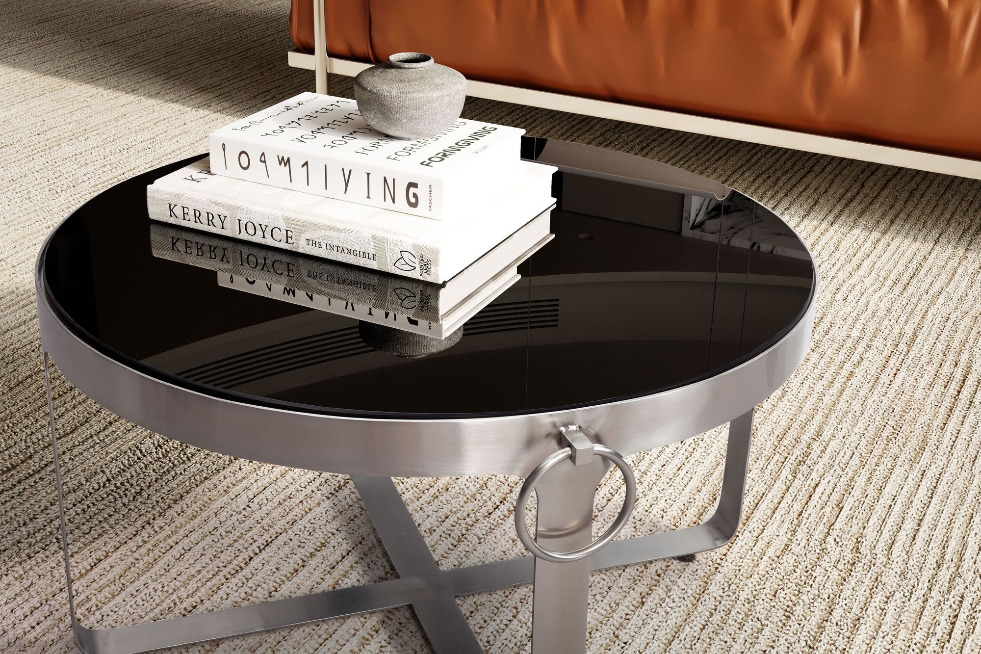 Scoprite questo tavolino rotondo dal design moderno con piano in vetro di sicurezza nero e struttura metallica argento lucido. La struttura robusta comprende due maniglie per facilitarne lo spostamento, perfetto per il soggiorno.