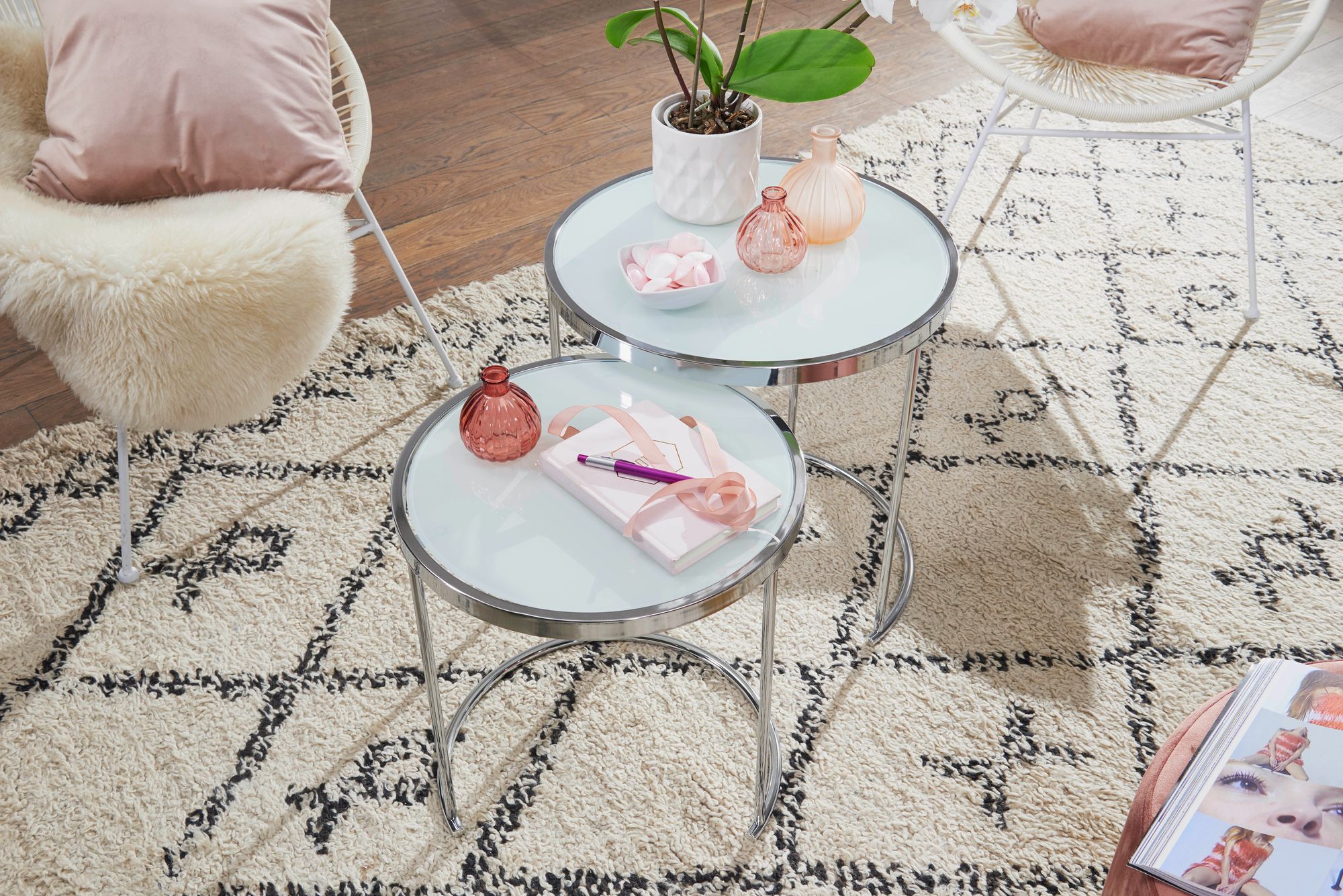 Questo set di due tavolini laterali rotondi presenta un design moderno con una raffinata combinazione di colori bianco e argento. I piani in vetro satinato poggiano su una struttura in acciaio cromato, donando un aspetto elegante e luminoso a ogni ambiente.