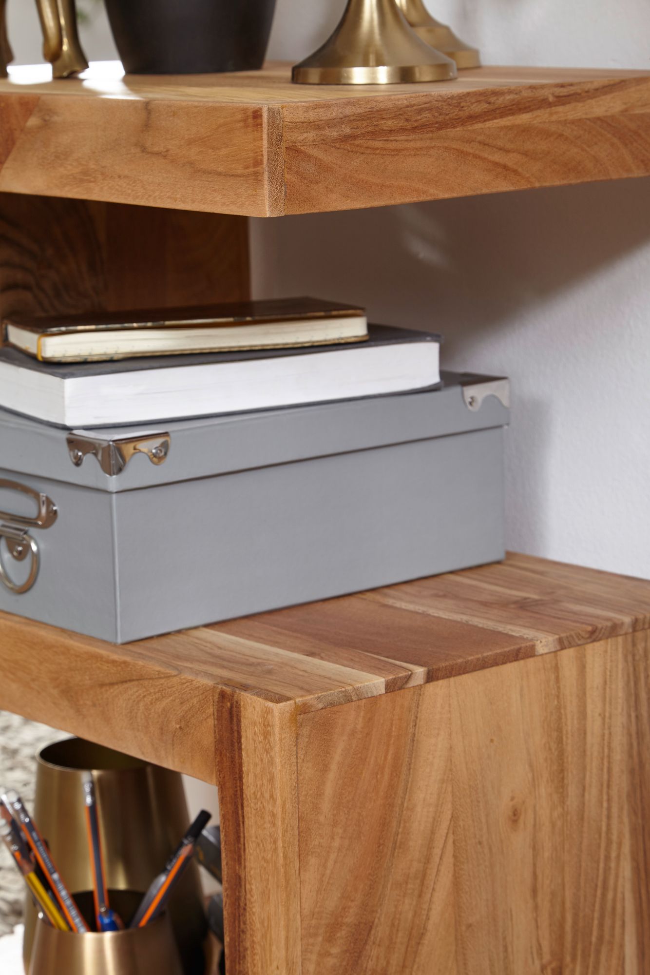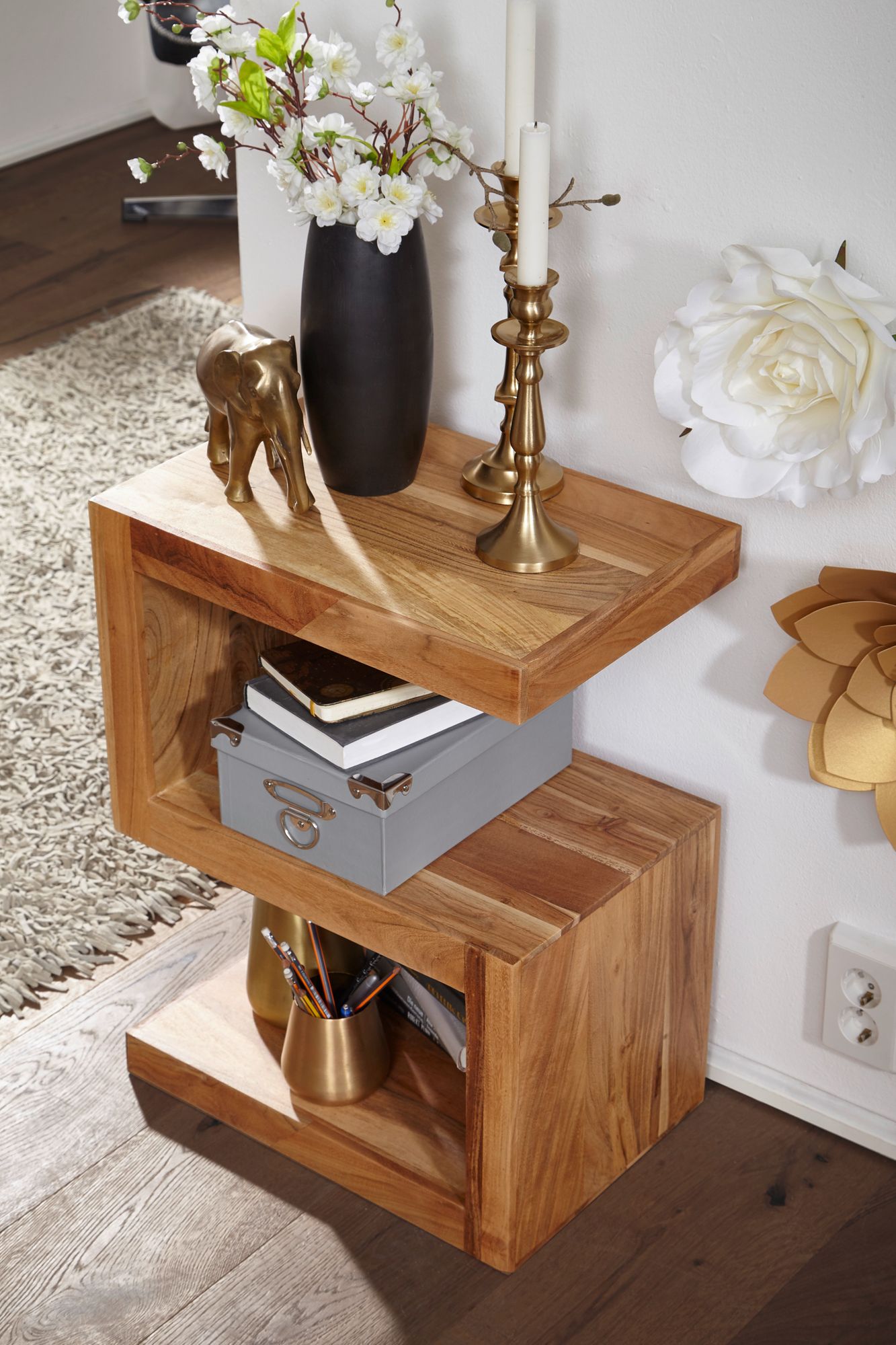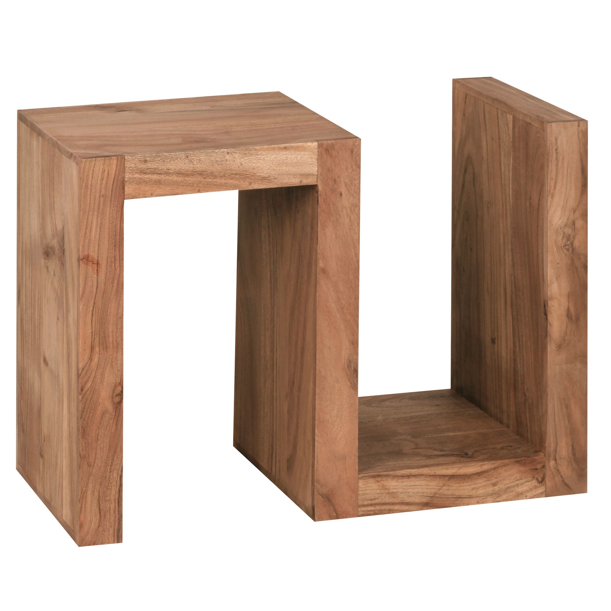 Scopri il tavolino d'appoggio MUMBAI in legno massello di acacia, alto 60 cm, perfetto per il tuo soggiorno. Il design a forma di S crea ulteriori spazi di deposito per riviste o oggetti decorativi.