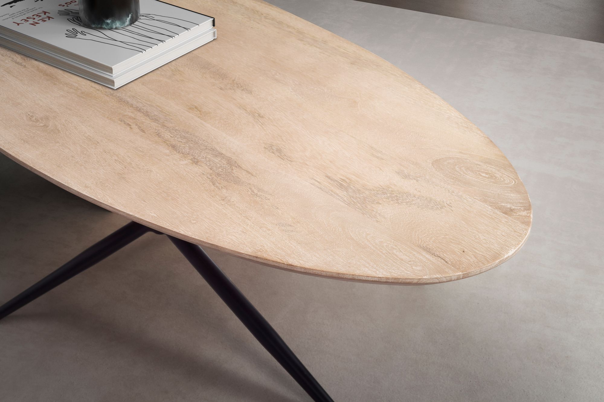 Aggiungi un tocco elegante in stile scandinavo al tuo soggiorno con questo tavolino ovale in legno massello di mango bianco tinto. La finitura calda e naturale mette in risalto le venature del legno, assicurando durabilità e unicità grazie alla lavorazione artigianale.