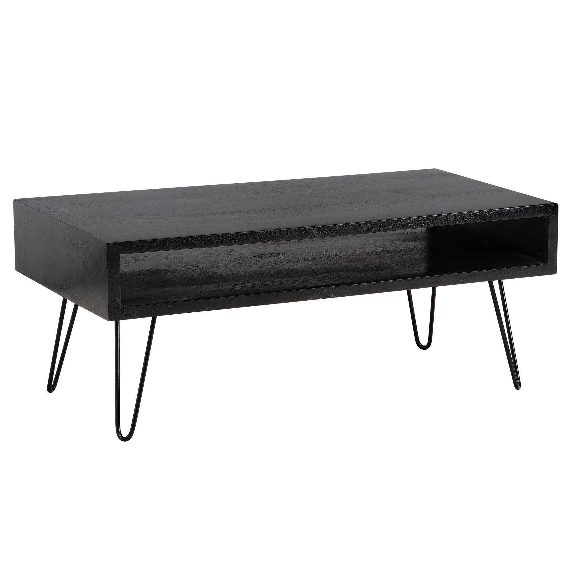 Aggiungi funzionalità ed eleganza al tuo soggiorno con questo tavolino rettangolare in legno massello di mango nero opaco. Supportato da quattro gambe a forcina in metallo nero, presenta un ampio vano contenitore sotto il piano.
