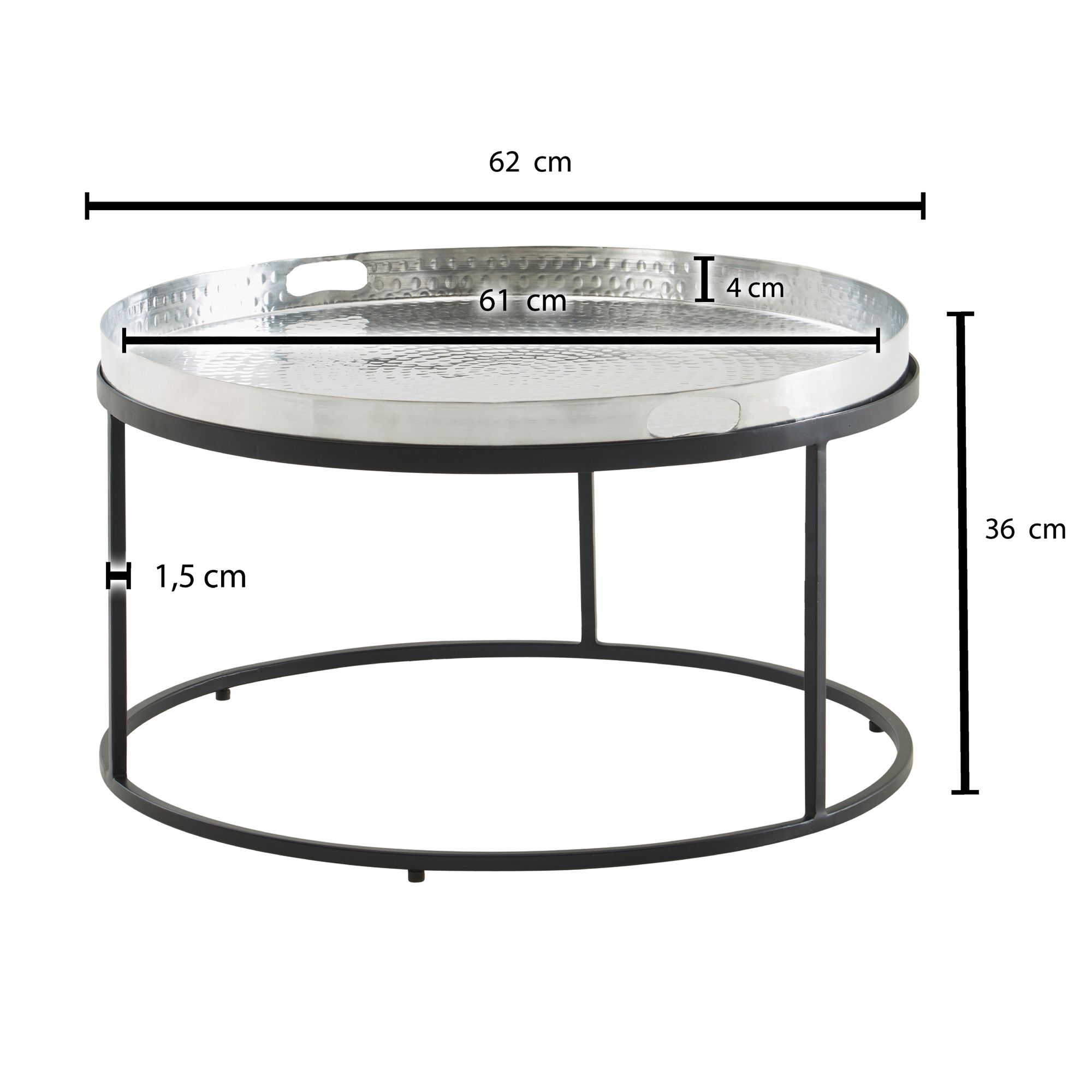 Goditi la combinazione di stile e funzionalità con questo tavolino rotondo in alluminio martellato finitura argento/nero. Il piano rimovibile con maniglie facilita lo spostamento e la pulizia.