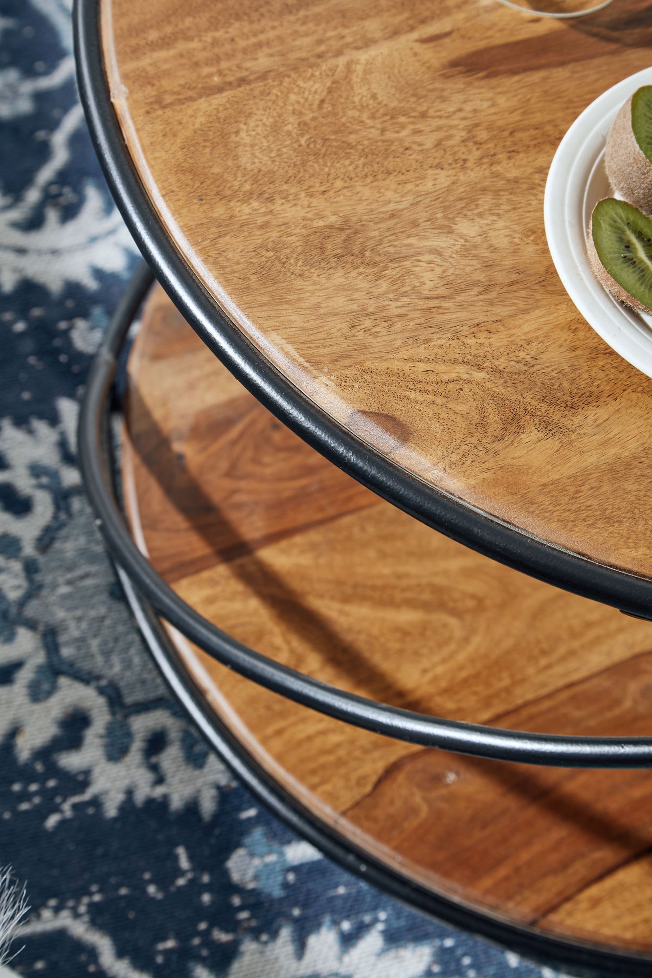 Questo tavolino rotondo in legno massiccio di Sheesham e metallo unisce robustezza ed eleganza per un soggiorno moderno. Il design unico presenta una struttura particolare e due ripiani in legno scuro con finitura trasparente, offrendo praticità e stile.