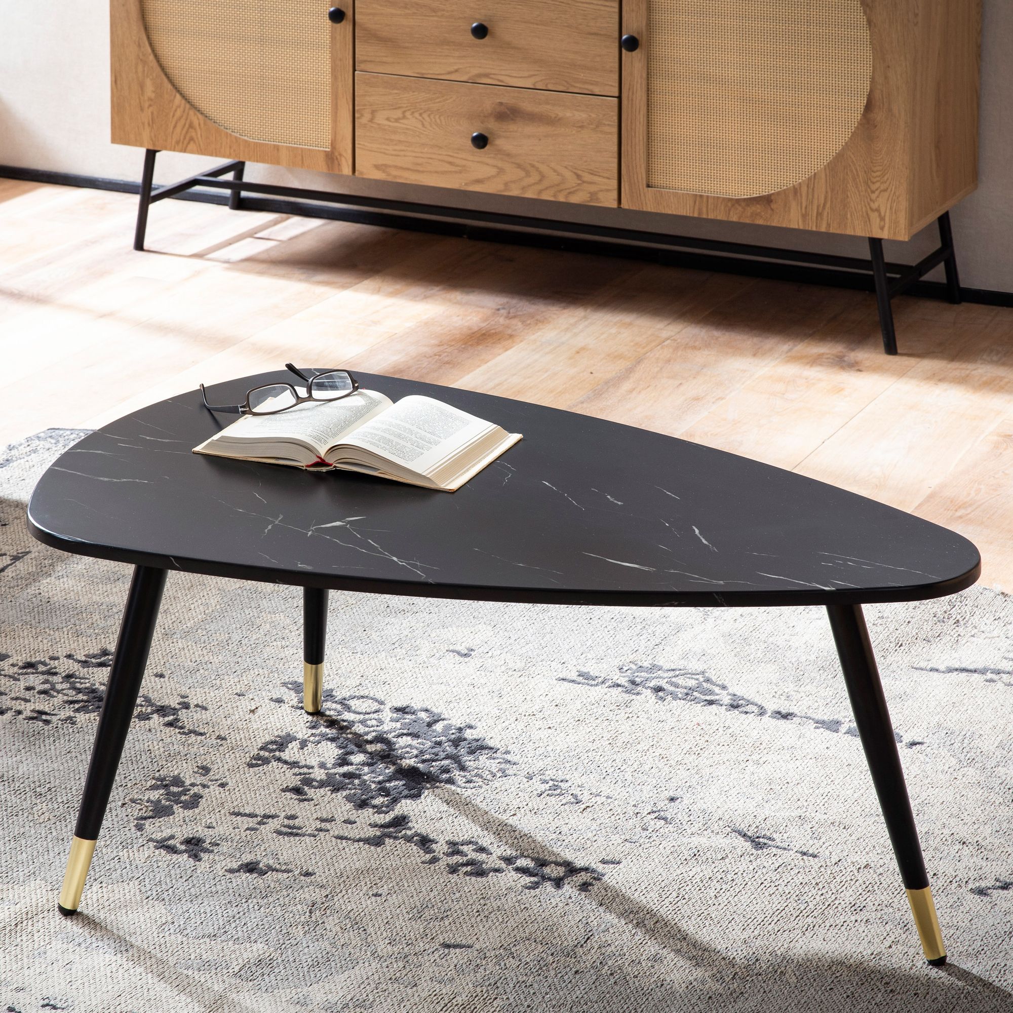 Aggiungi un tocco di stile al soggiorno con questo tavolino triangolare nero dall'effetto marmo. Il piano in MDF pellicolato offre un aspetto elegante, mentre le solide gambe in metallo nero e oro garantiscono stabilità.